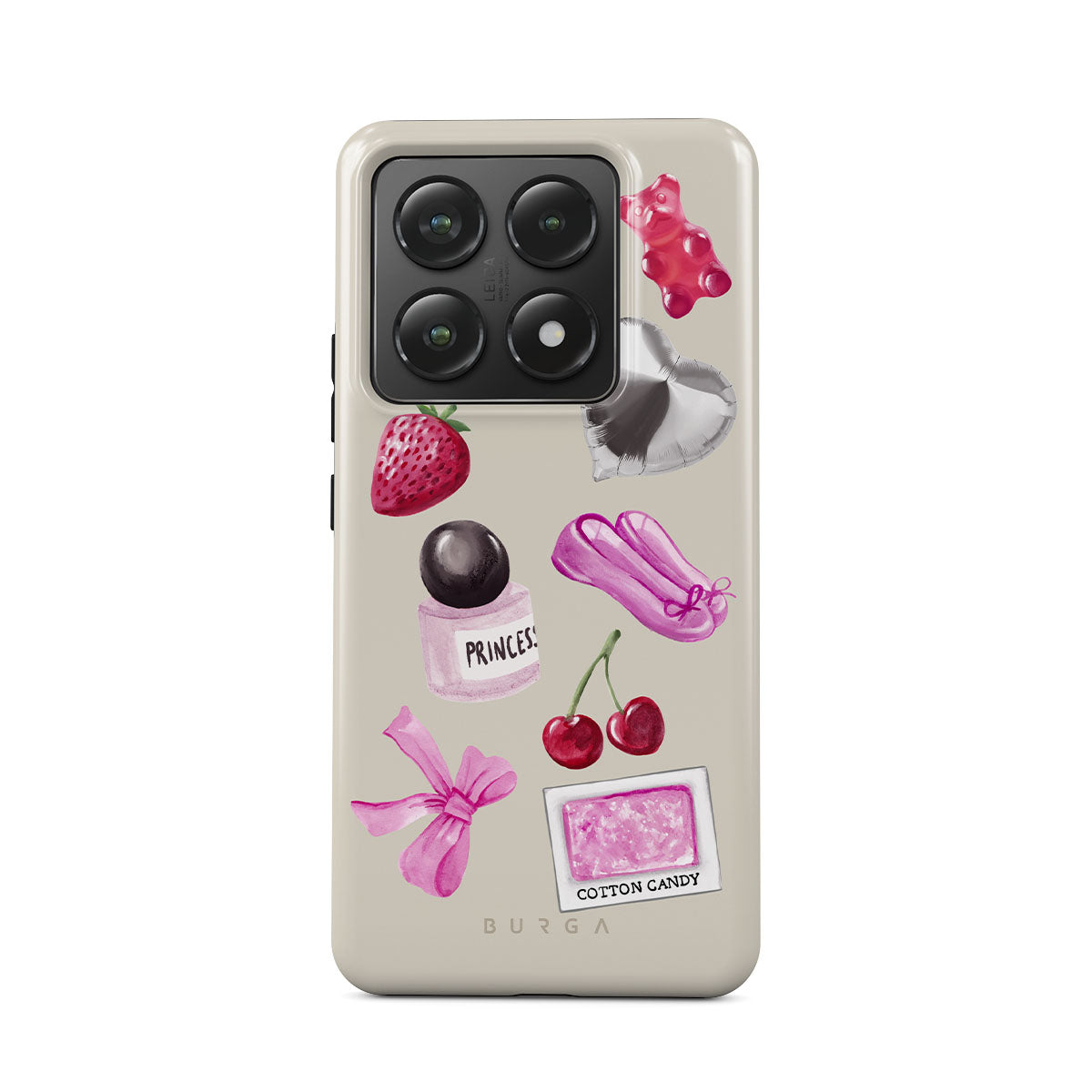 En este diseño: lazo rosa, globo plateado en forma de corazón, frasco de perfume, fresa, cerezas, zapatillas de ballet rosas, sticker de algodón de azúcar, osito de goma rosa.