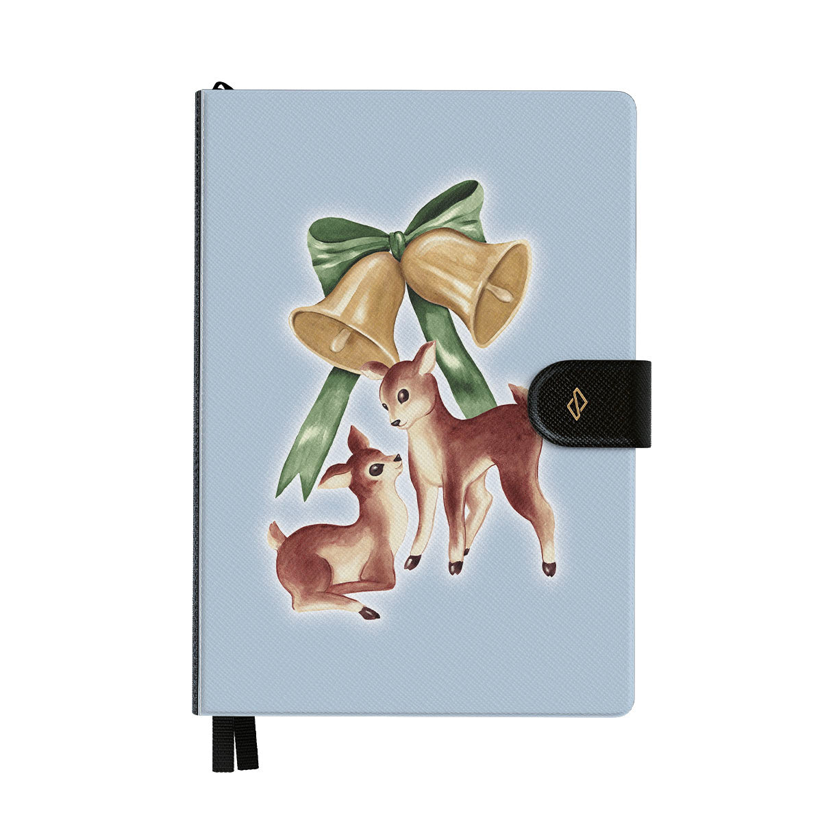 En este diseño: reno vintage, campanas de Navidad, campanas doradas, ilustración retro de reno, ciervo bebé, fondo azul claro