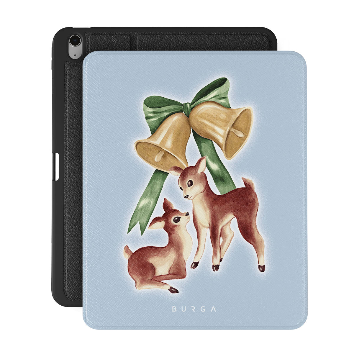 En este diseño: reno vintage, campanas de Navidad, campanas doradas, ilustración retro de reno, ciervo bebé, fondo azul claro