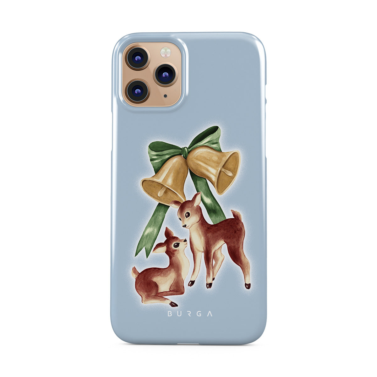 En este diseño: reno vintage, campanas de Navidad, campanas doradas, ilustración retro de reno, ciervo bebé, fondo azul claro