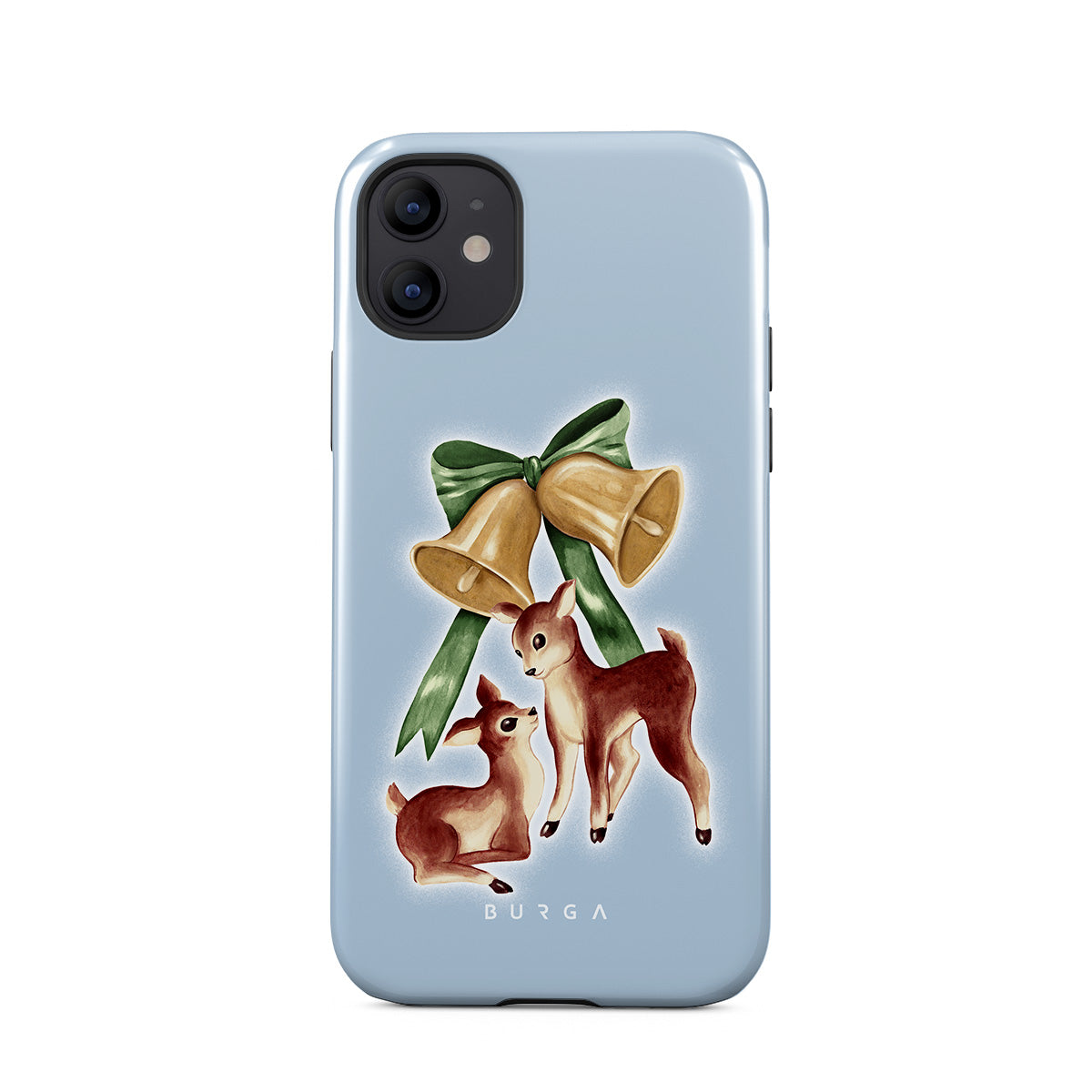 En este diseño: reno vintage, campanas de Navidad, campanas doradas, ilustración retro de reno, ciervo bebé, fondo azul claro