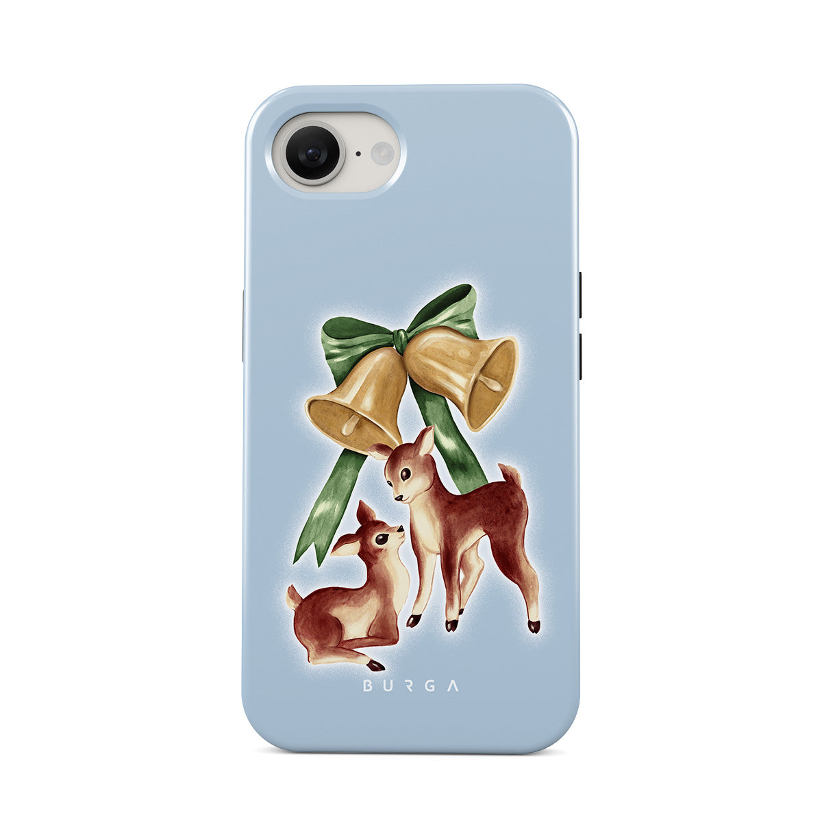 En este diseño: reno vintage, campanas de Navidad, campanas doradas, ilustración retro de reno, ciervo bebé, fondo azul claro