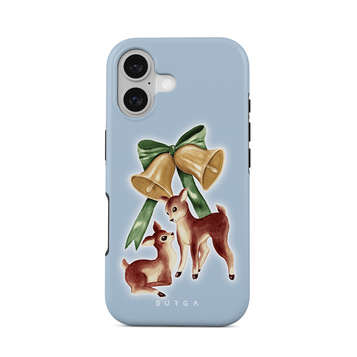 En este diseño: reno vintage, campanas de Navidad, campanas doradas, ilustración retro de reno, ciervo bebé, fondo azul claro