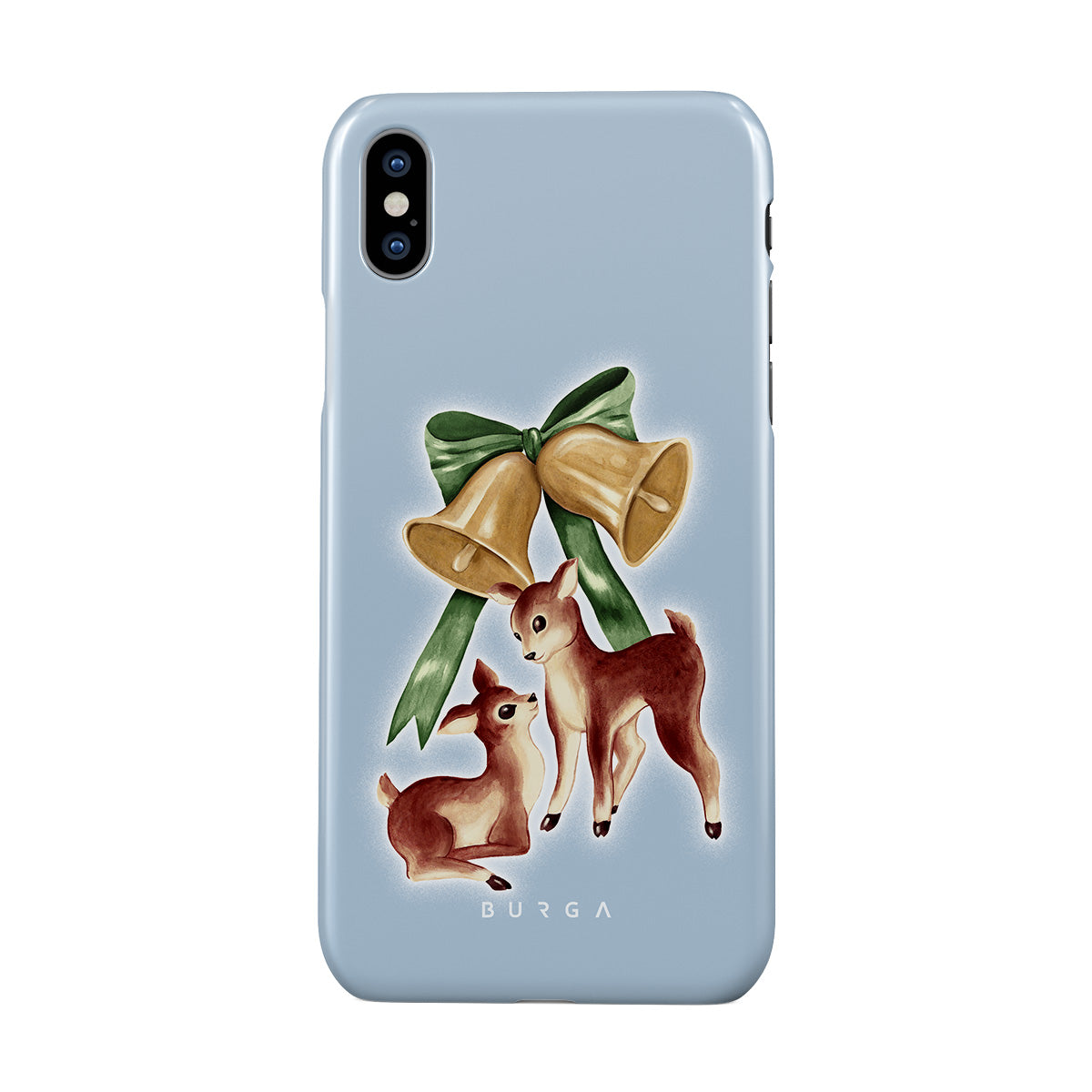 En este diseño: reno vintage, campanas de Navidad, campanas doradas, ilustración retro de reno, ciervo bebé, fondo azul claro