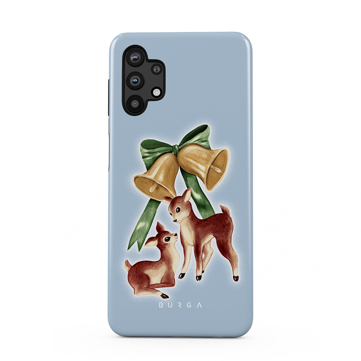En este diseño: reno vintage, campanas de Navidad, campanas doradas, ilustración retro de reno, ciervo bebé, fondo azul claro