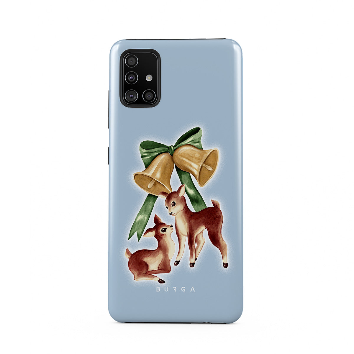 En este diseño: reno vintage, campanas de Navidad, campanas doradas, ilustración retro de reno, ciervo bebé, fondo azul claro