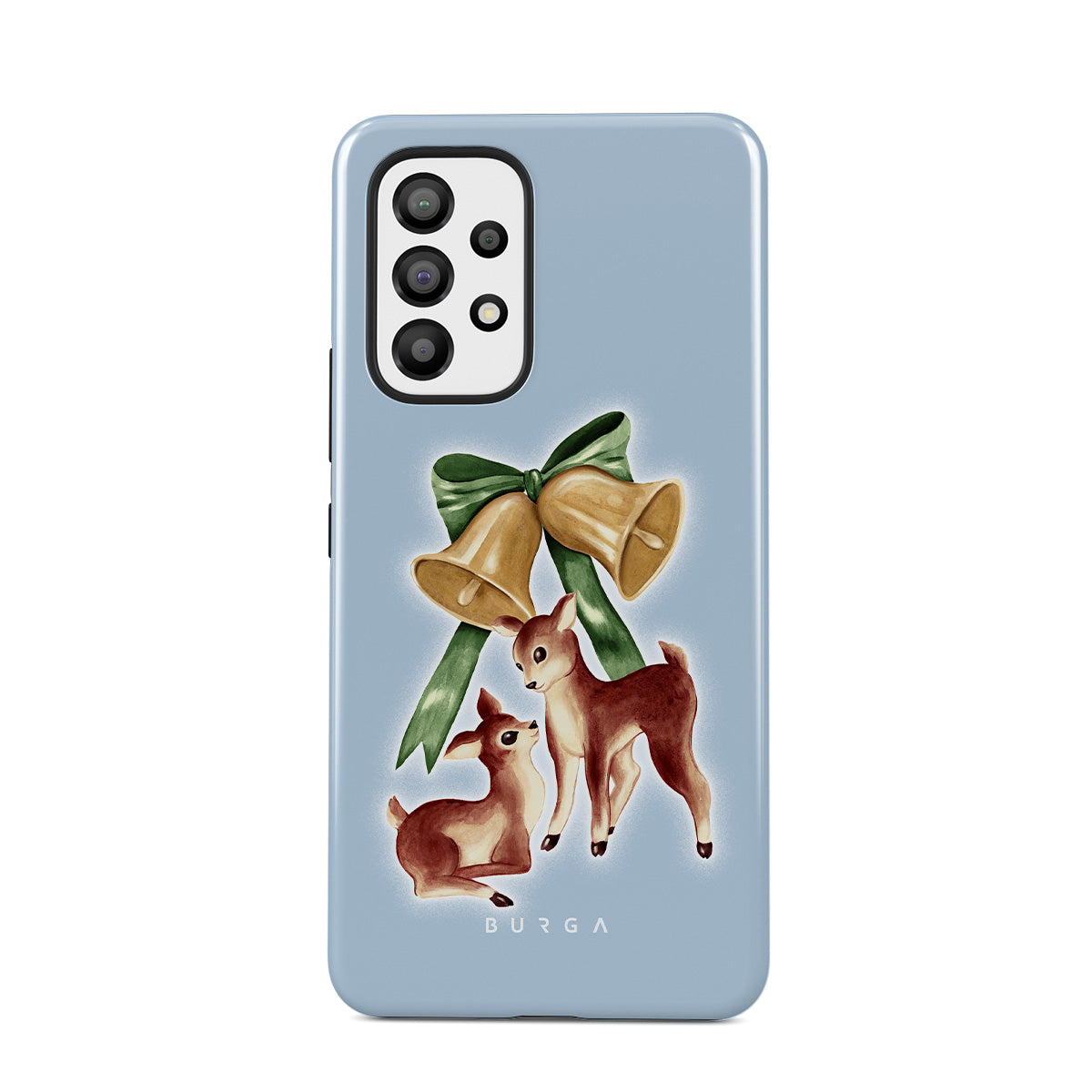 En este diseño: reno vintage, campanas de Navidad, campanas doradas, ilustración retro de reno, ciervo bebé, fondo azul claro