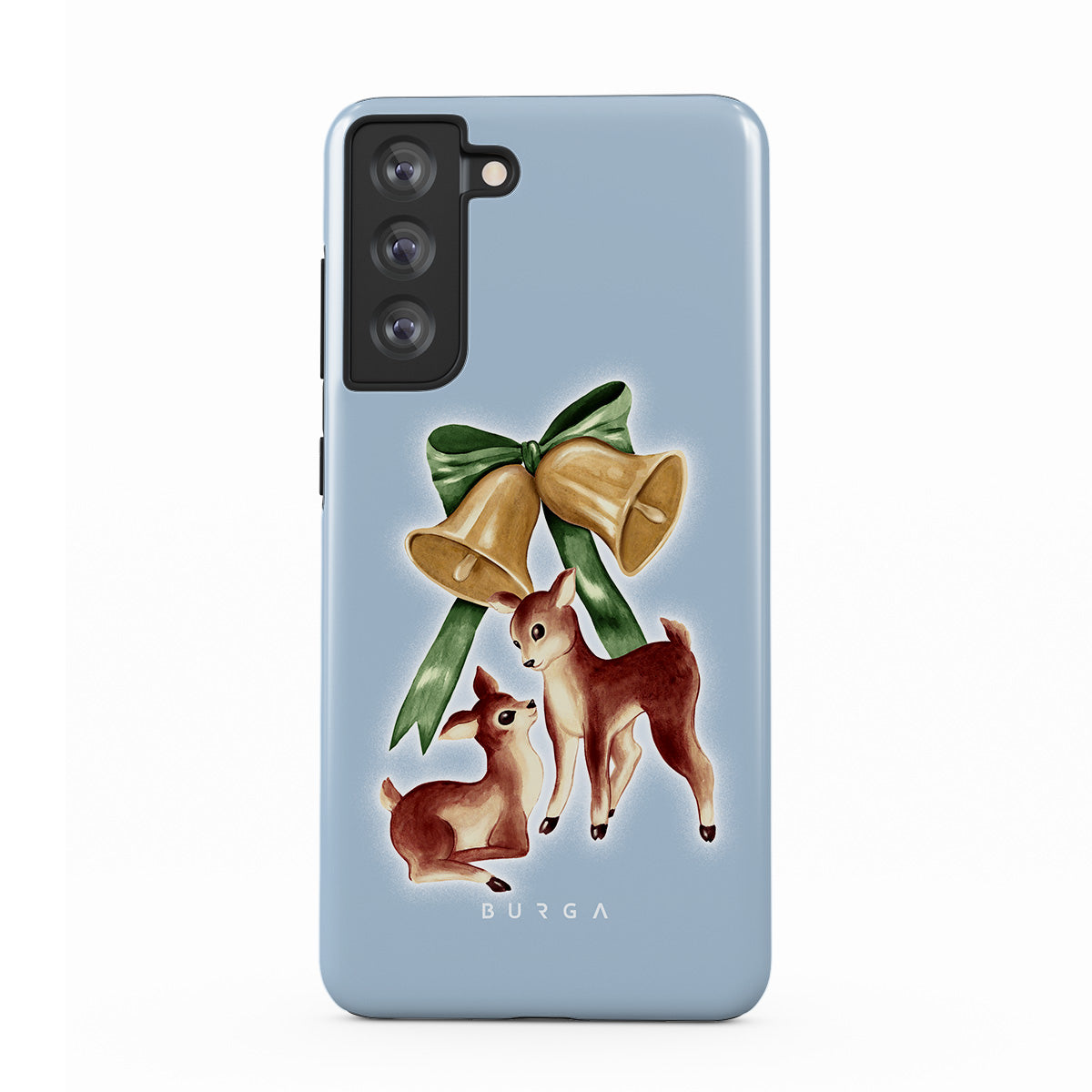 En este diseño: reno vintage, campanas de Navidad, campanas doradas, ilustración retro de reno, ciervo bebé, fondo azul claro