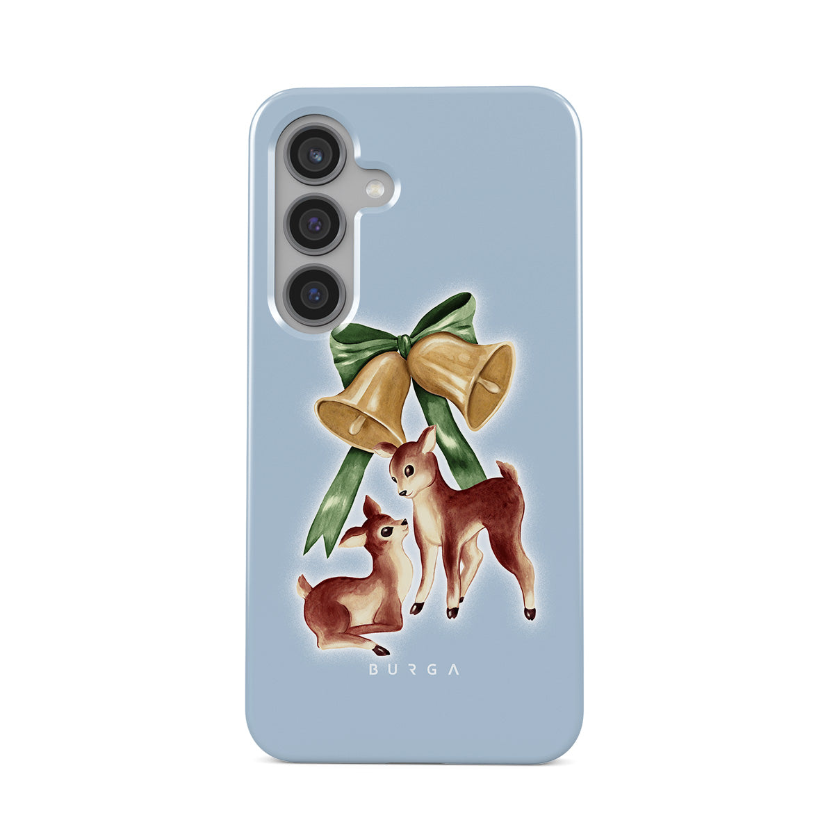 En este diseño: reno vintage, campanas de Navidad, campanas doradas, ilustración retro de reno, ciervo bebé, fondo azul claro