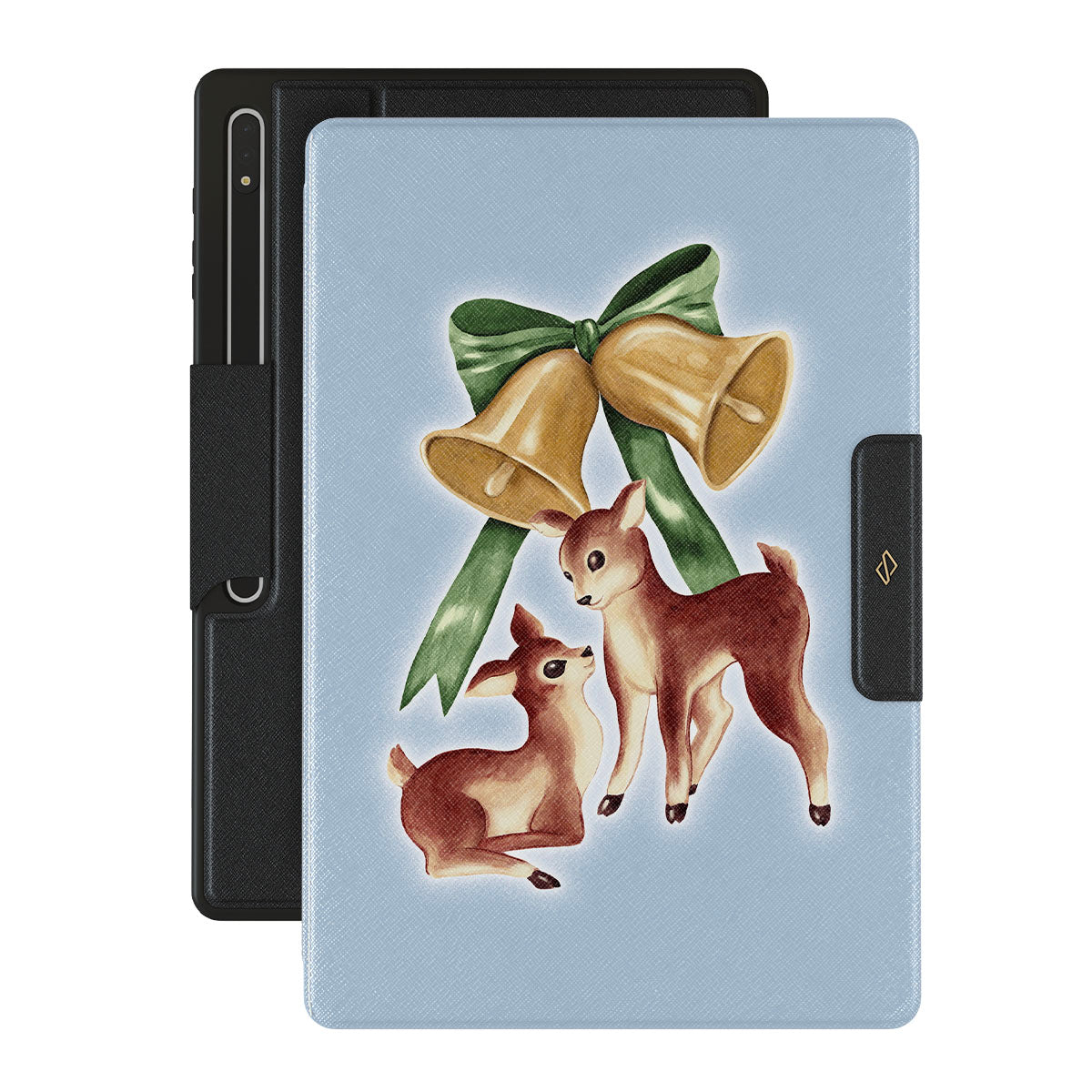 En este diseño: reno vintage, campanas de Navidad, campanas doradas, ilustración retro de reno, ciervo bebé, fondo azul claro