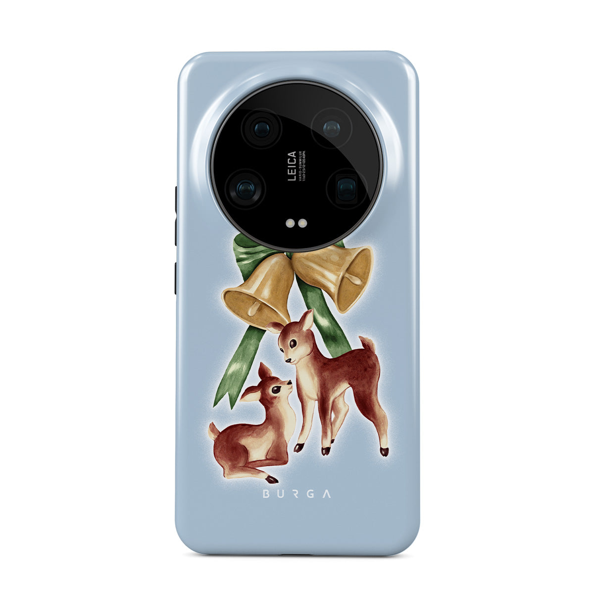 En este diseño: reno vintage, campanas de Navidad, campanas doradas, ilustración retro de reno, ciervo bebé, fondo azul claro