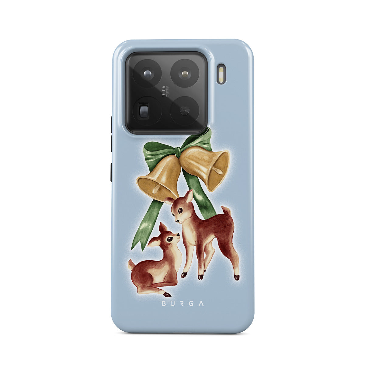 En este diseño: reno vintage, campanas de Navidad, campanas doradas, ilustración retro de reno, ciervo bebé, fondo azul claro