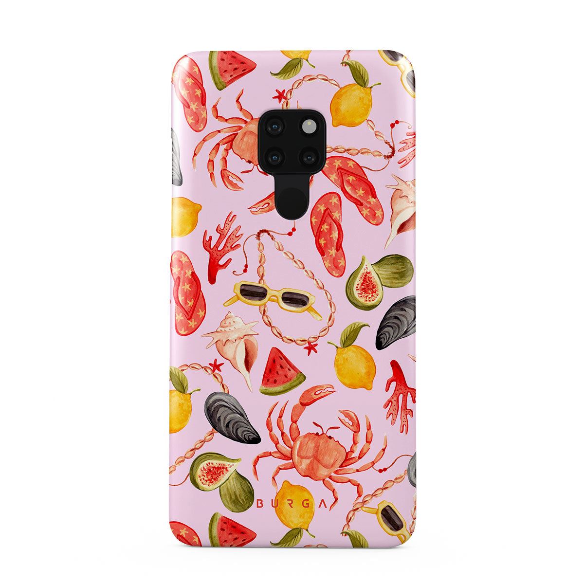 En este diseño: sandía, gafas de sol, mariscos, cangrejo, chanclas, ostras, limón, colores vibrantes, tema tropical