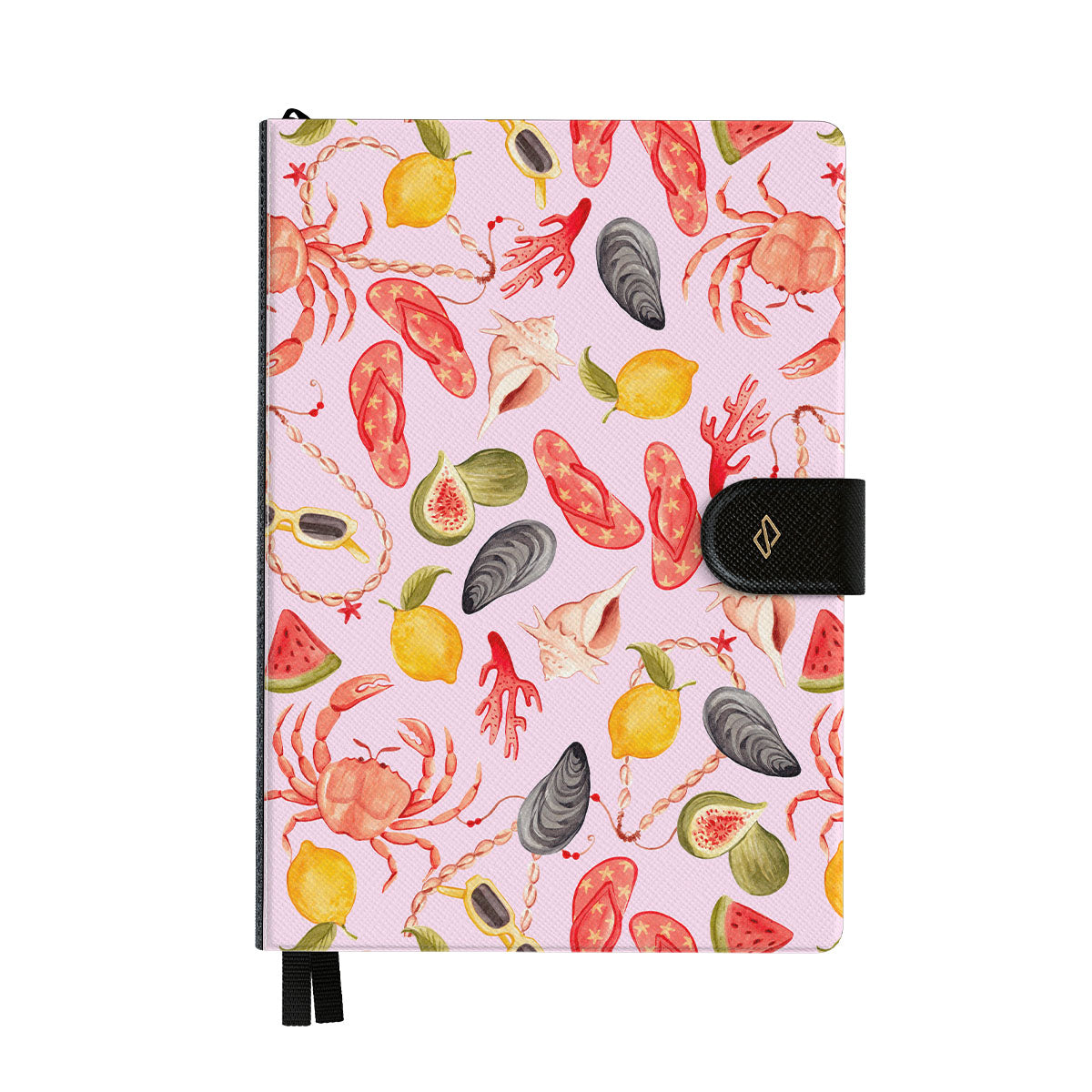 En este diseño: sandía, gafas de sol, mariscos, cangrejo, chanclas, ostras, limón, colores vibrantes, tema tropical