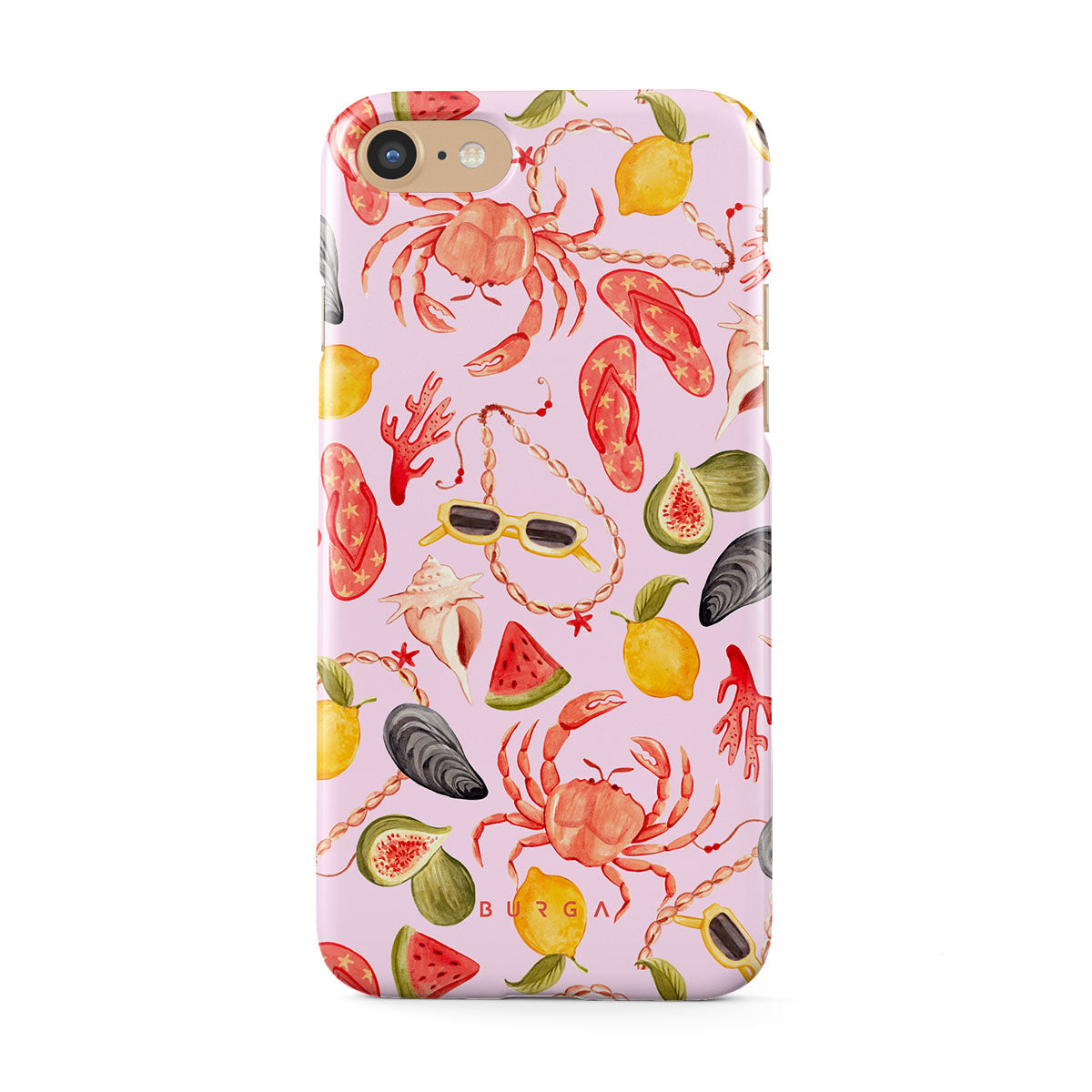 En este diseño: sandía, gafas de sol, mariscos, cangrejo, chanclas, ostras, limón, colores vibrantes, tema tropical