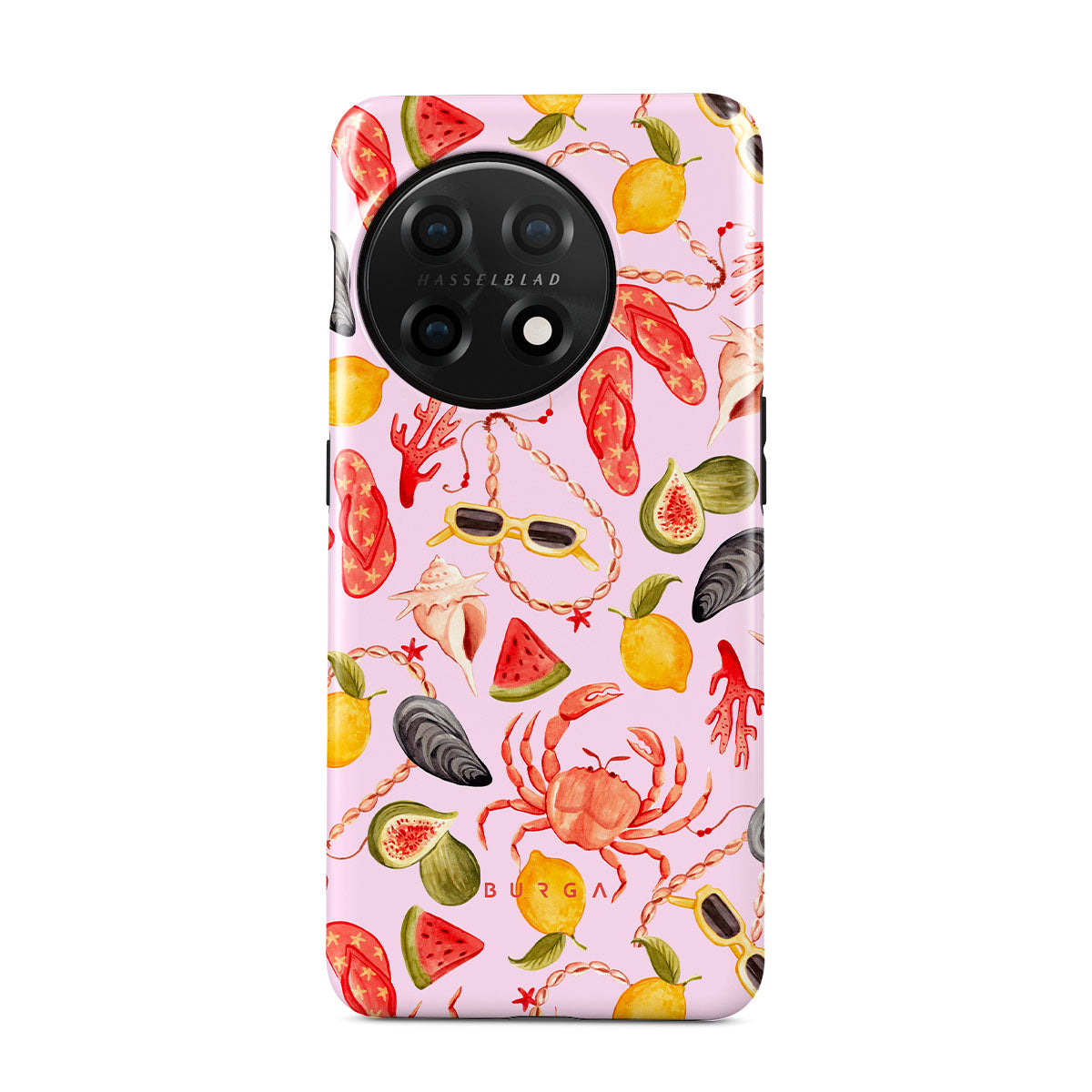 En este diseño: sandía, gafas de sol, mariscos, cangrejo, chanclas, ostras, limón, colores vibrantes, tema tropical
