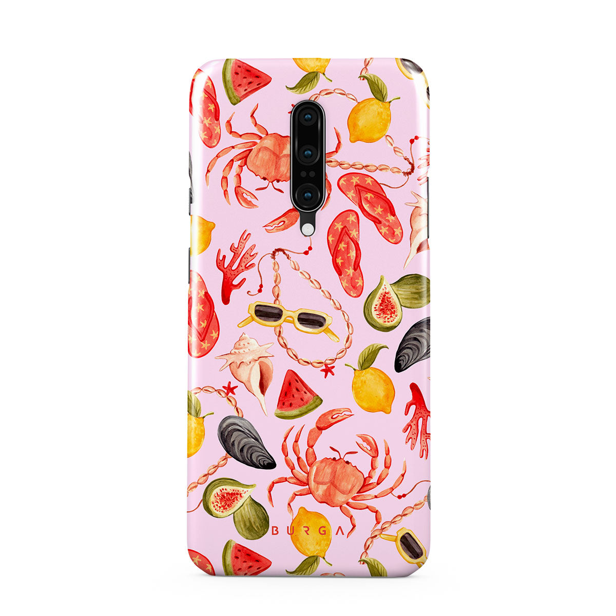 En este diseño: sandía, gafas de sol, mariscos, cangrejo, chanclas, ostras, limón, colores vibrantes, tema tropical