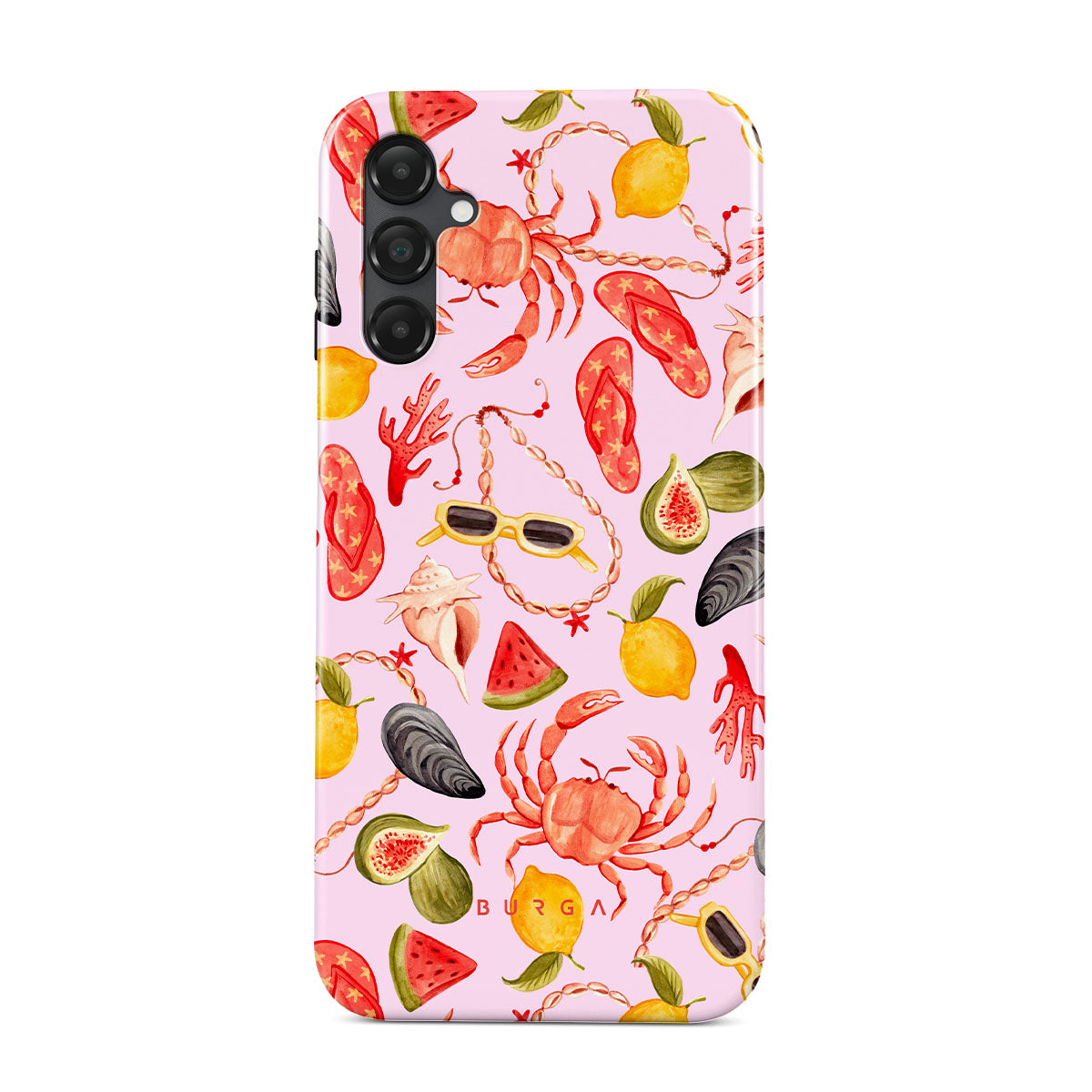 En este diseño: sandía, gafas de sol, mariscos, cangrejo, chanclas, ostras, limón, colores vibrantes, tema tropical