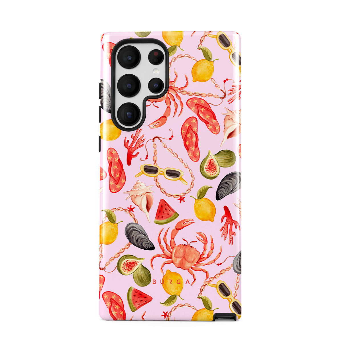 En este diseño: sandía, gafas de sol, mariscos, cangrejo, chanclas, ostras, limón, colores vibrantes, tema tropical