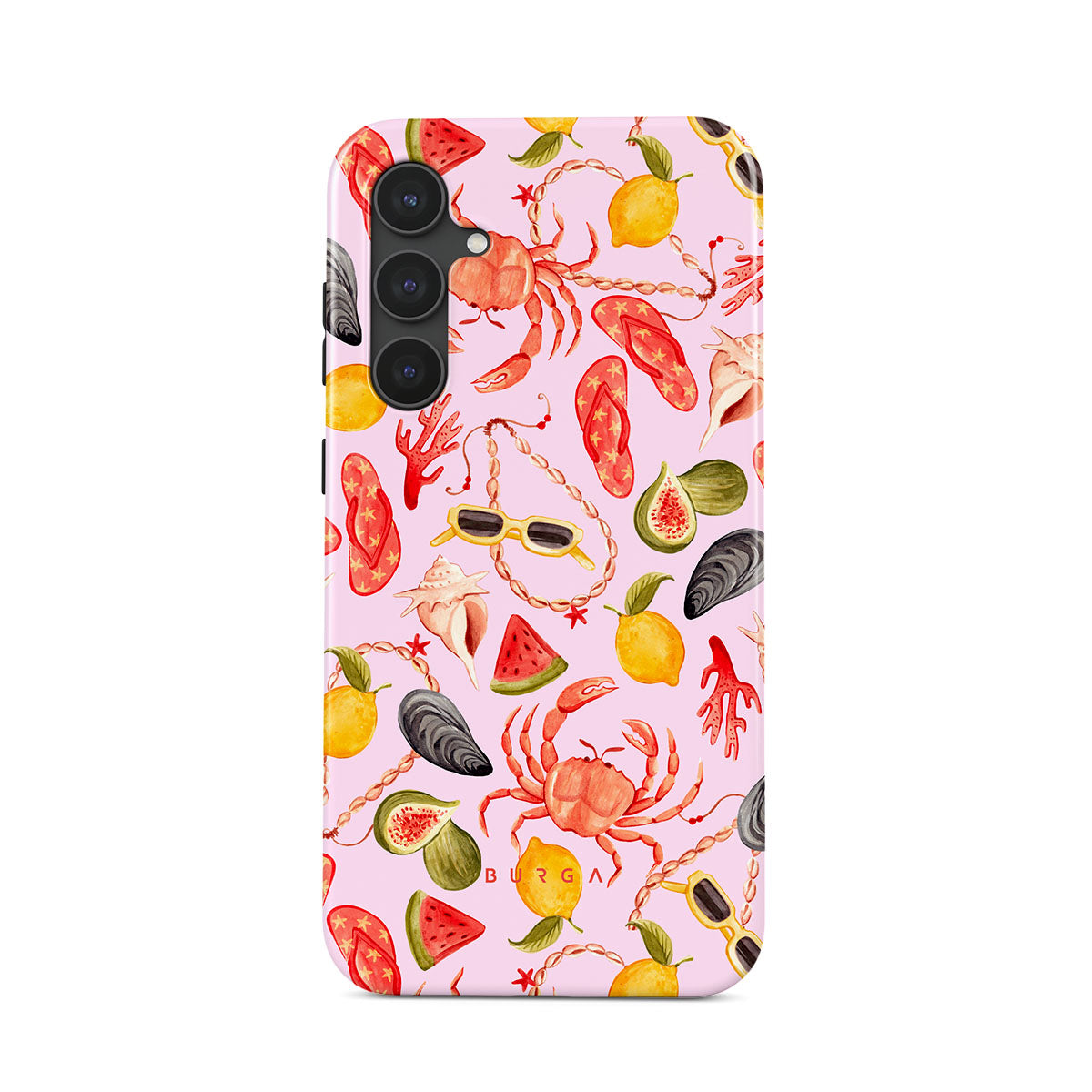 En este diseño: sandía, gafas de sol, mariscos, cangrejo, chanclas, ostras, limón, colores vibrantes, tema tropical