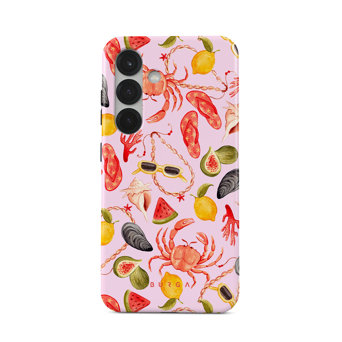 En este diseño: sandía, gafas de sol, mariscos, cangrejo, chanclas, ostras, limón, colores vibrantes, tema tropical