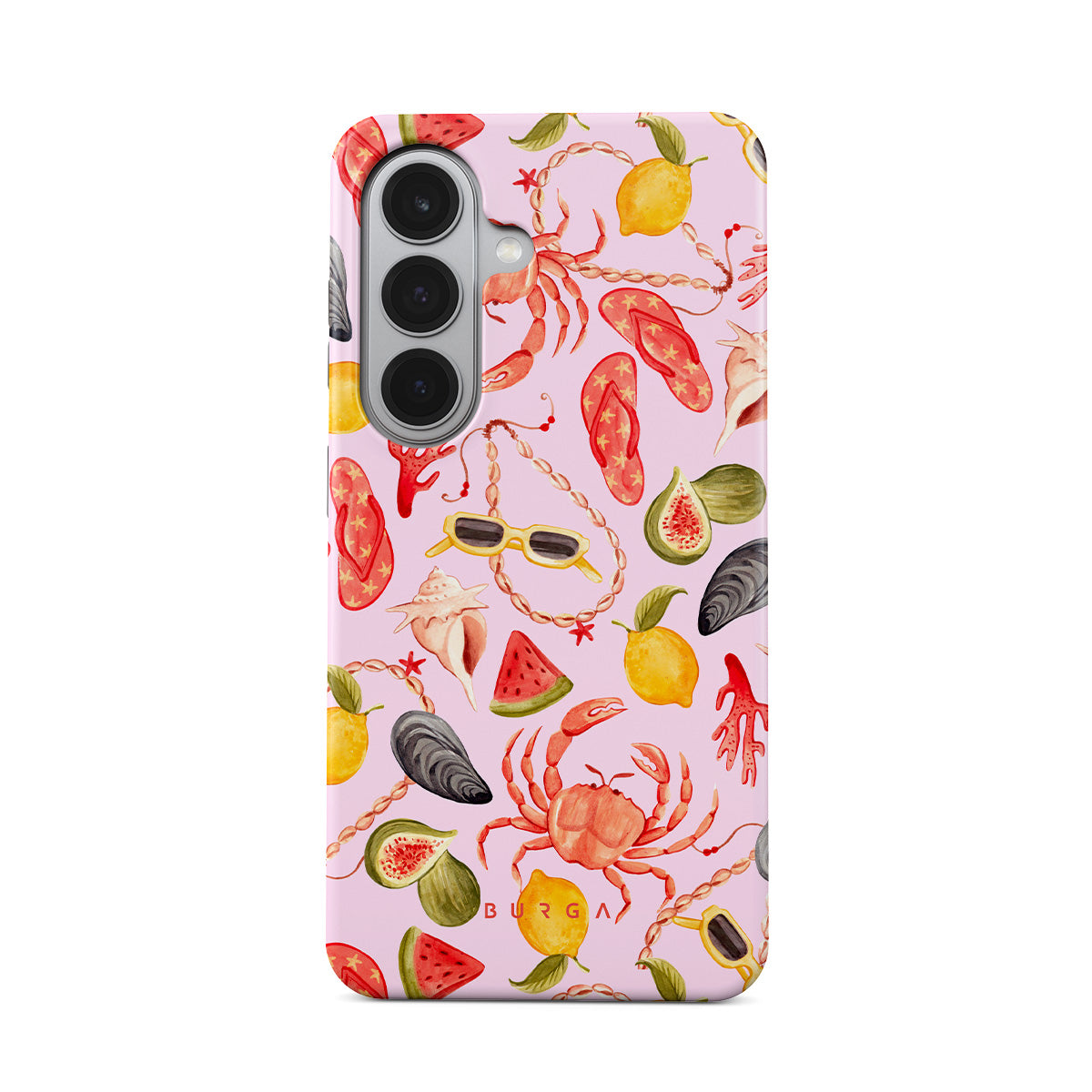 En este diseño: sandía, gafas de sol, mariscos, cangrejo, chanclas, ostras, limón, colores vibrantes, tema tropical