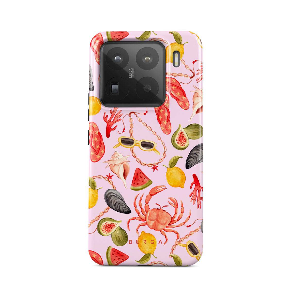 En este diseño: sandía, gafas de sol, mariscos, cangrejo, chanclas, ostras, limón, colores vibrantes, tema tropical