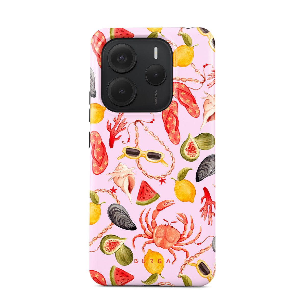 En este diseño: sandía, gafas de sol, mariscos, cangrejo, chanclas, ostras, limón, colores vibrantes, tema tropical