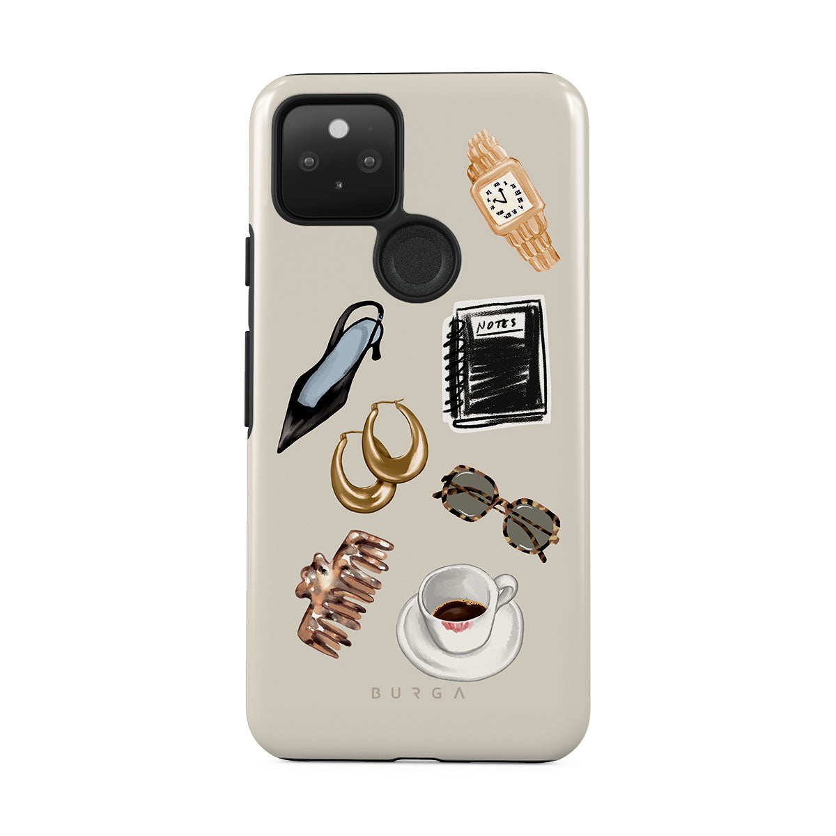 En este diseño: tacón negro, aros dorados, cuaderno negro, taza de café, gafas de carey, scrunchie marrón, reloj retro dorado.