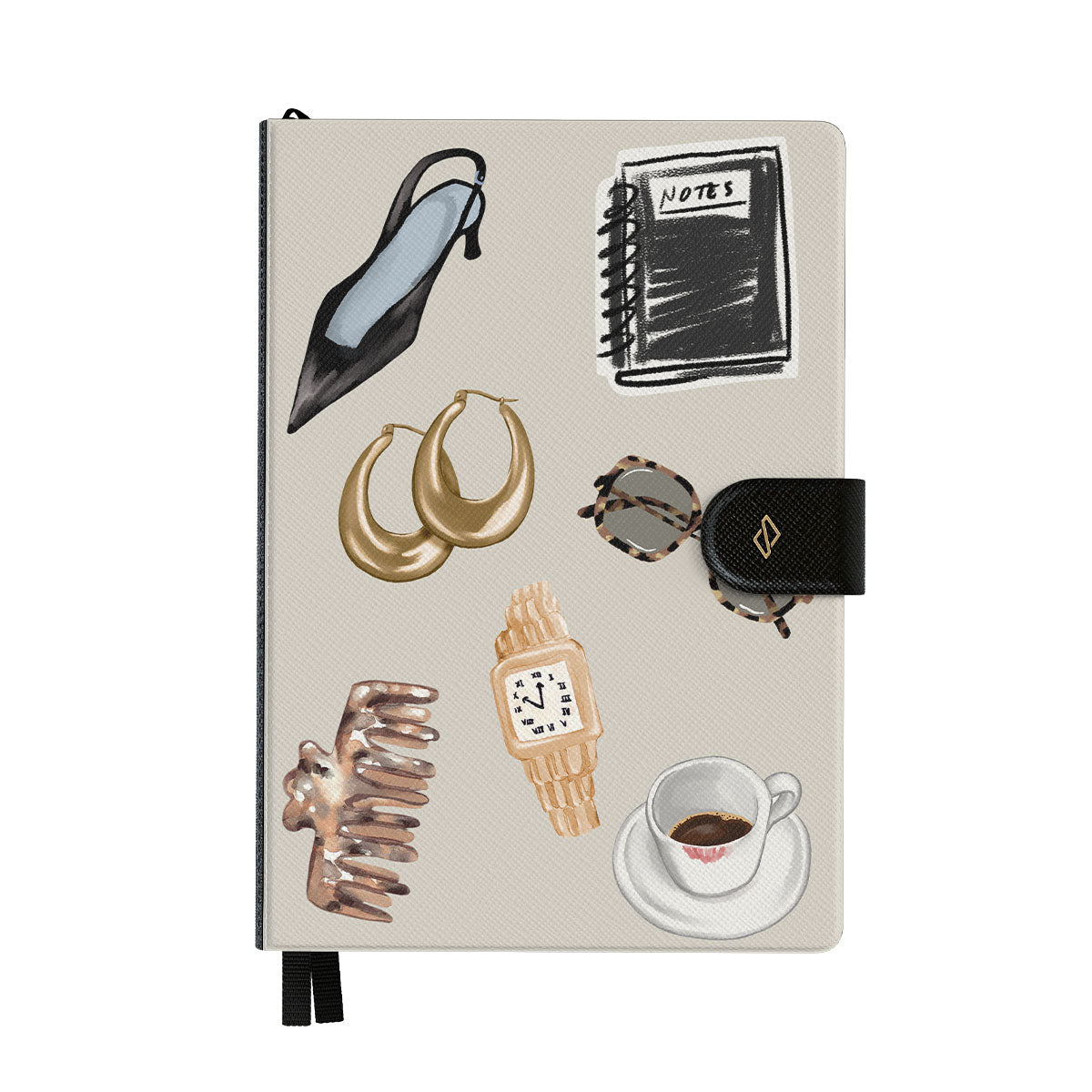 En este diseño: tacón negro, aros dorados, cuaderno negro, taza de café, gafas de carey, scrunchie marrón, reloj retro dorado.