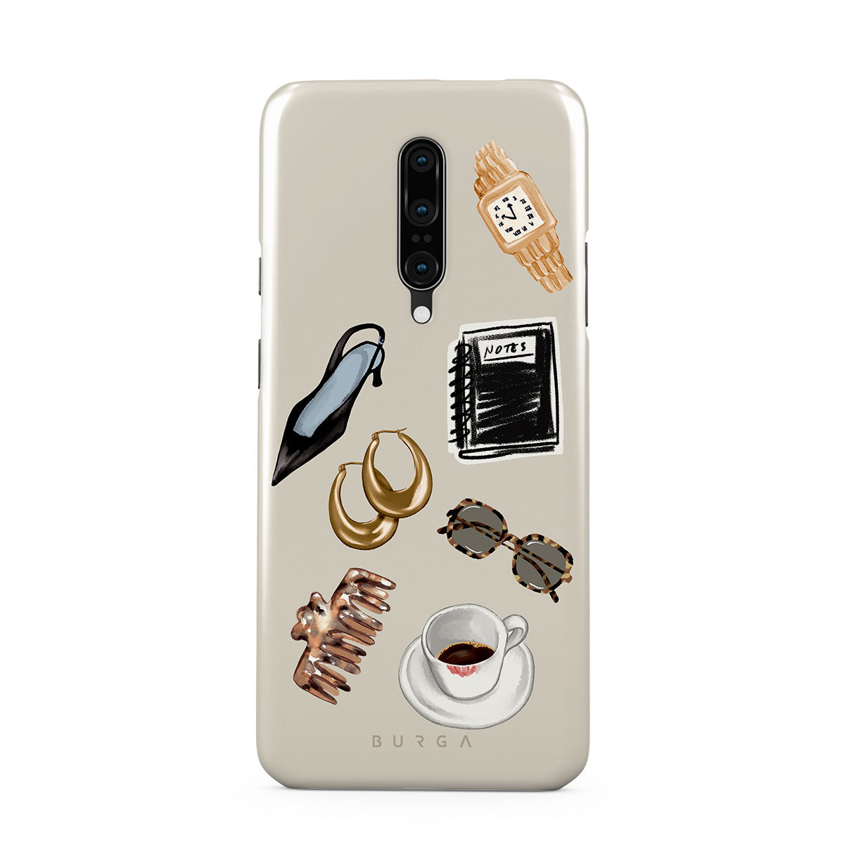En este diseño: tacón negro, aros dorados, cuaderno negro, taza de café, gafas de carey, scrunchie marrón, reloj retro dorado.
