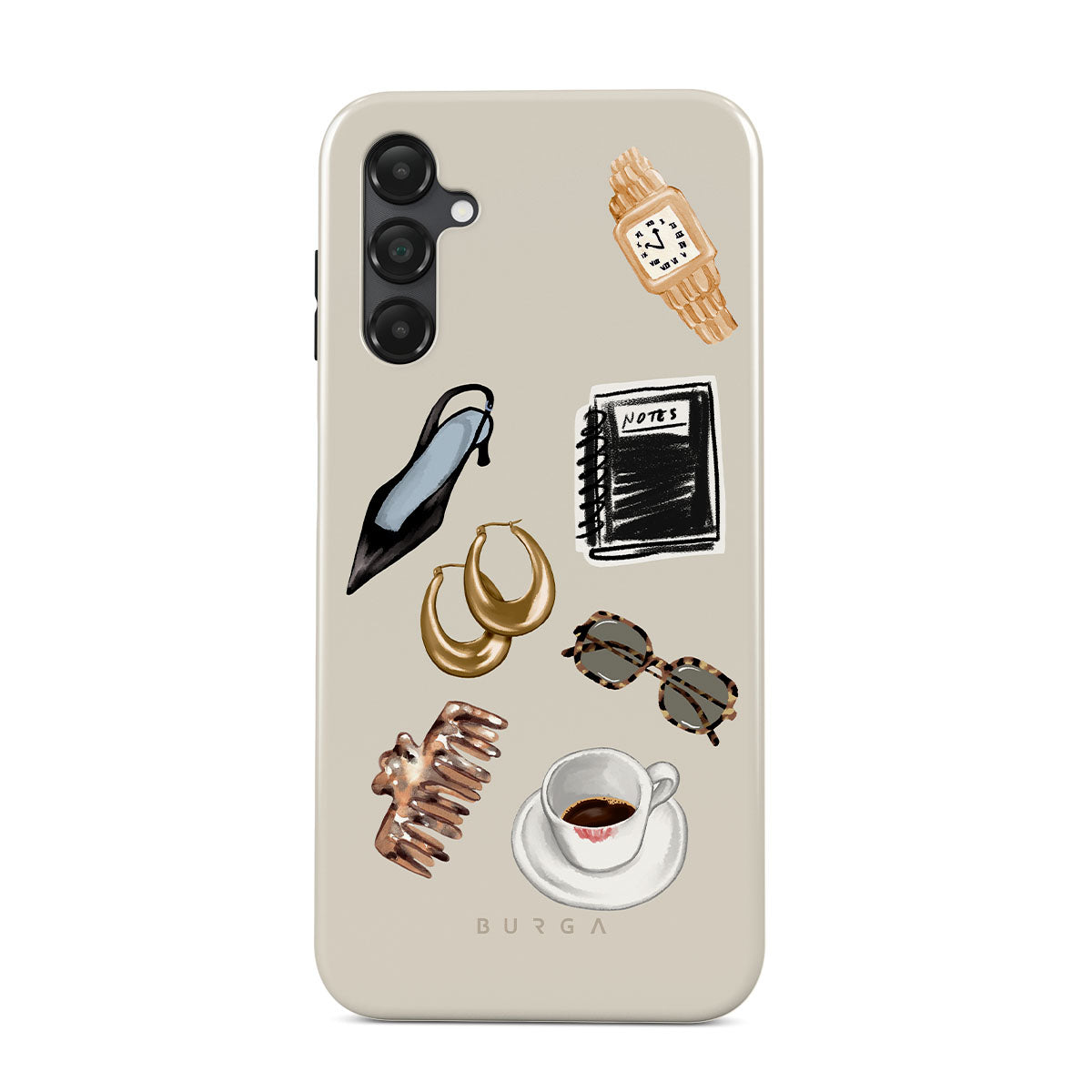 En este diseño: tacón negro, aros dorados, cuaderno negro, taza de café, gafas de carey, scrunchie marrón, reloj retro dorado.