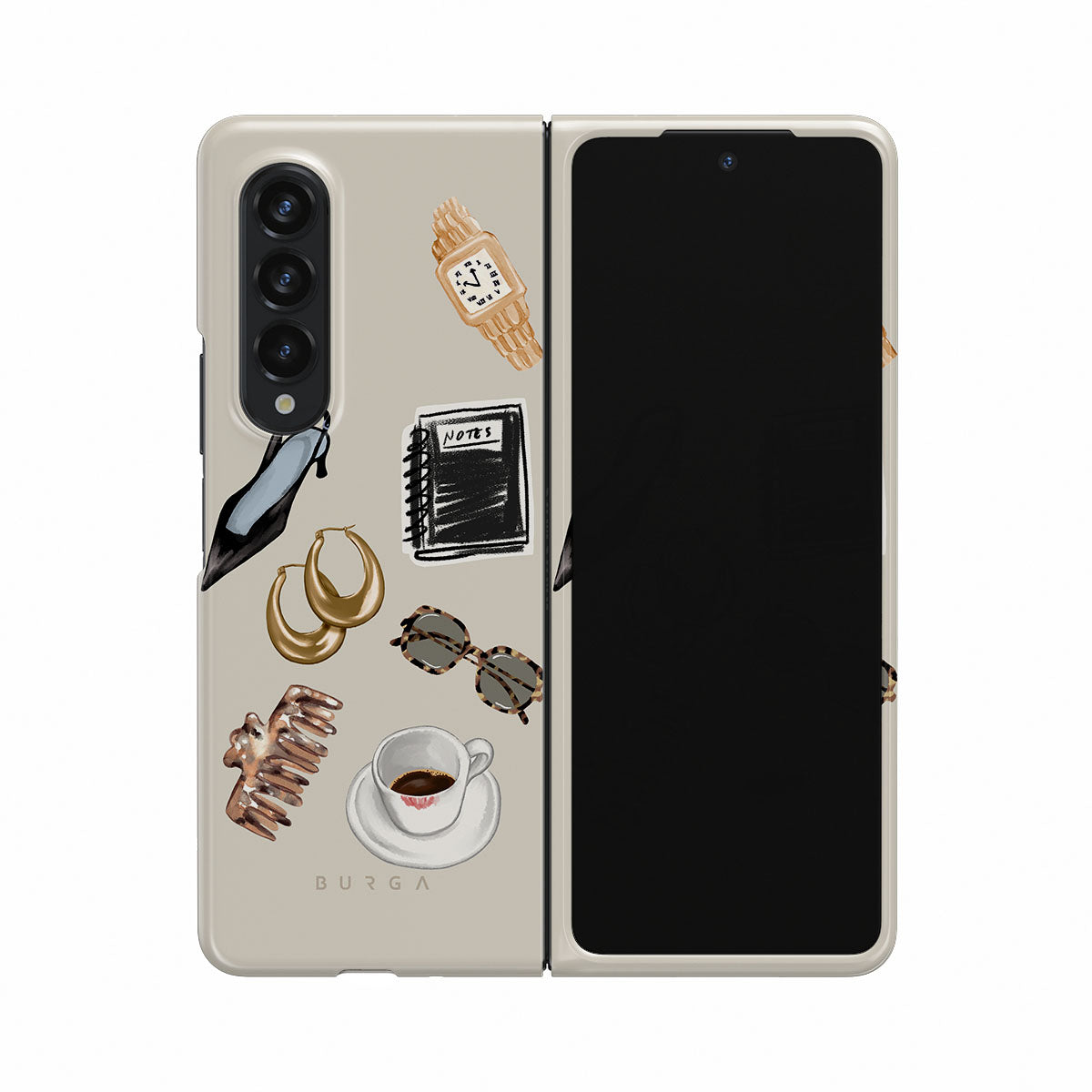 En este diseño: tacón negro, aros dorados, cuaderno negro, taza de café, gafas de carey, scrunchie marrón, reloj retro dorado.