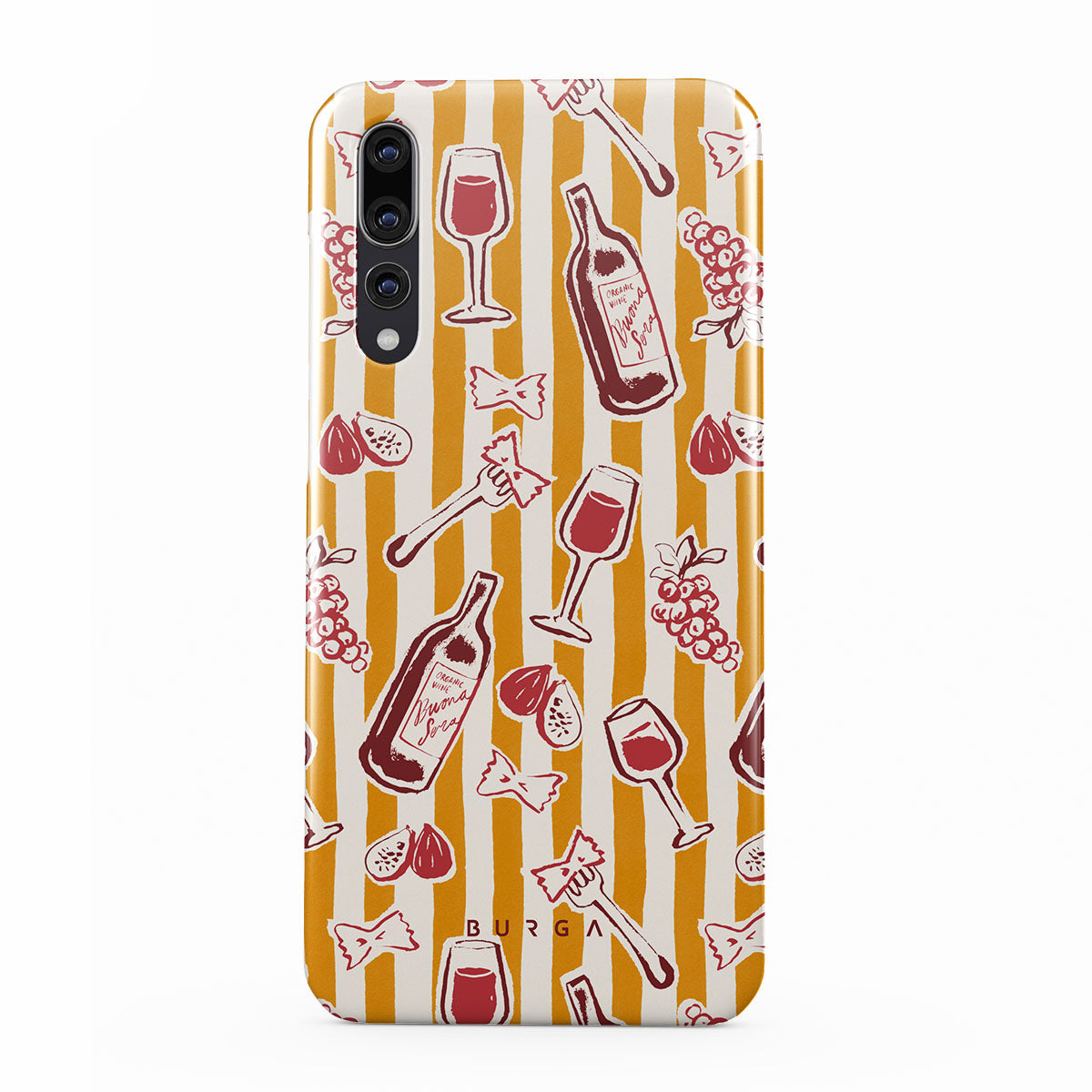 En este diseño: frutas, higos, uvas, tenedores, pasta, vino, copa, rayas.