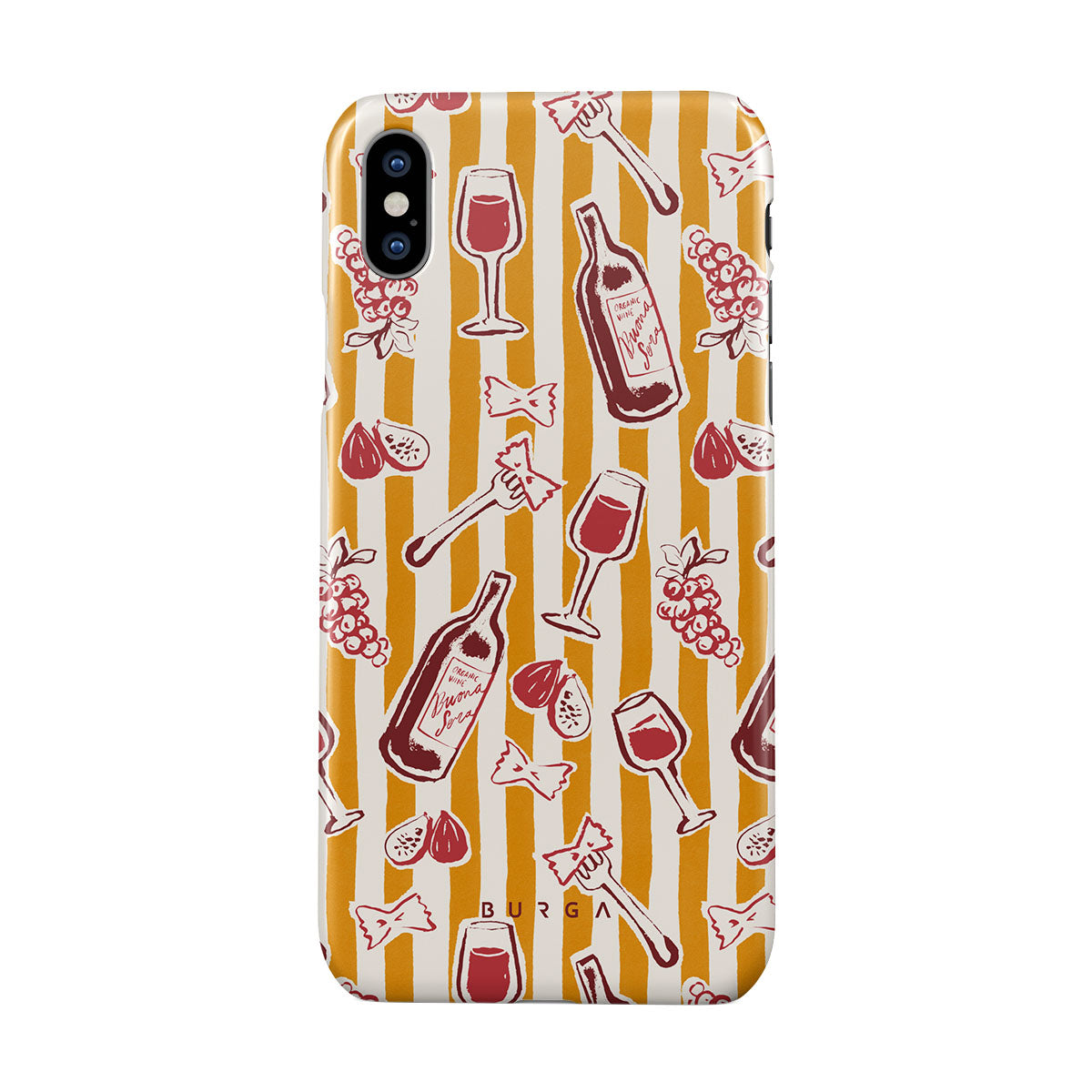 En este diseño: frutas, higos, uvas, tenedores, pasta, vino, copa, rayas.