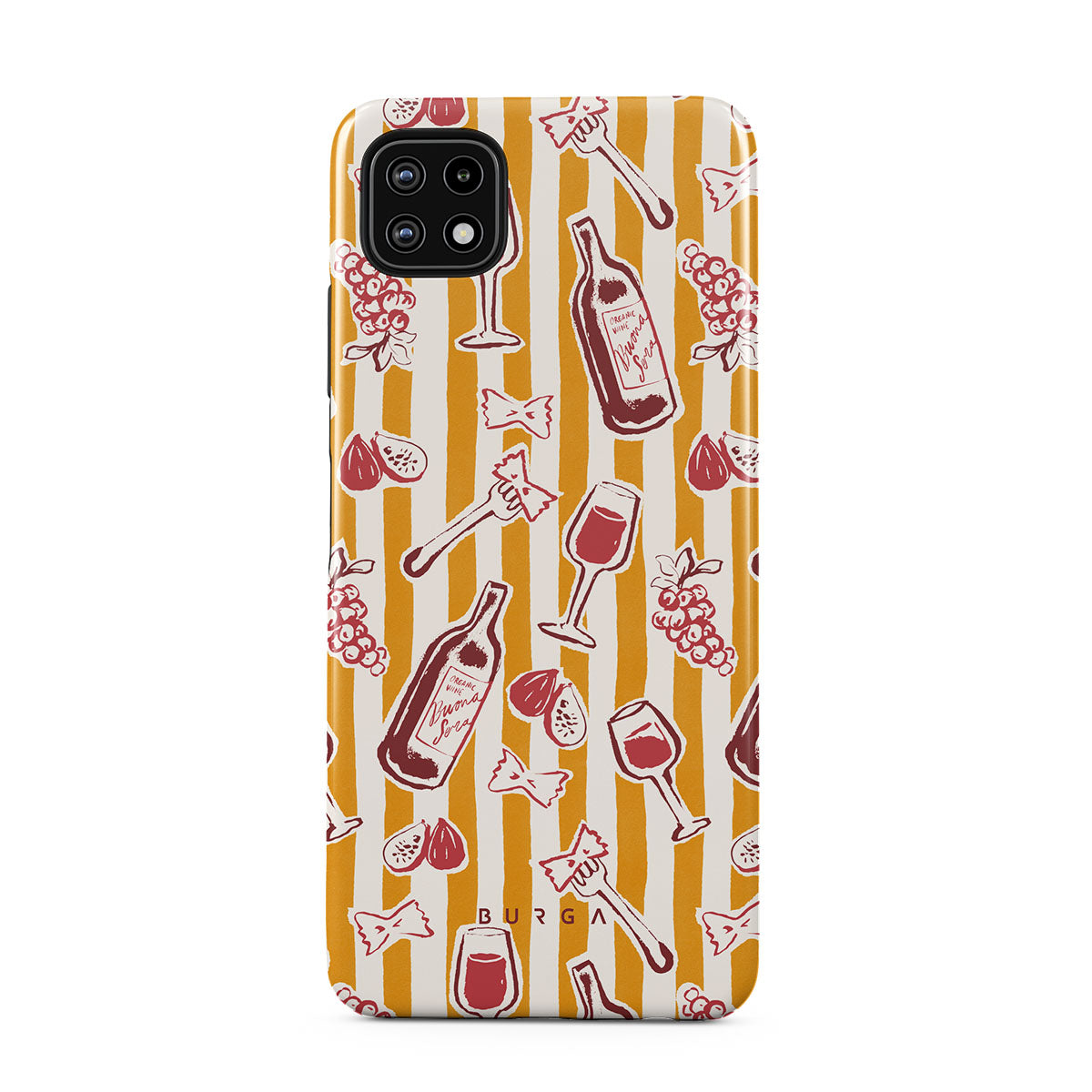 En este diseño: frutas, higos, uvas, tenedores, pasta, vino, copa, rayas.