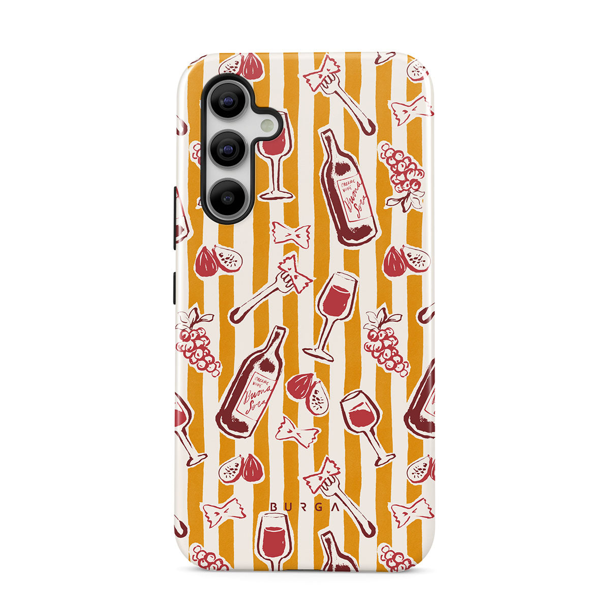 En este diseño: frutas, higos, uvas, tenedores, pasta, vino, copa, rayas.