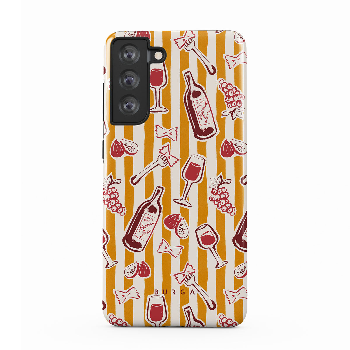 En este diseño: frutas, higos, uvas, tenedores, pasta, vino, copa, rayas.