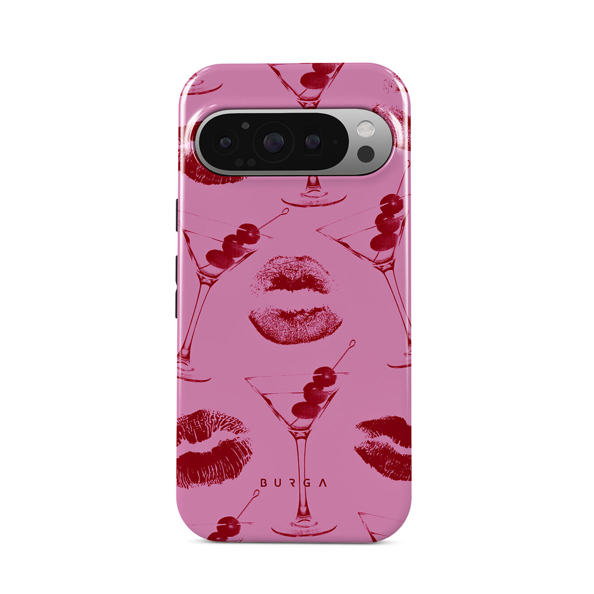 Este diseño presenta: labios rojos, besos, copas de cóctel, martinis.
