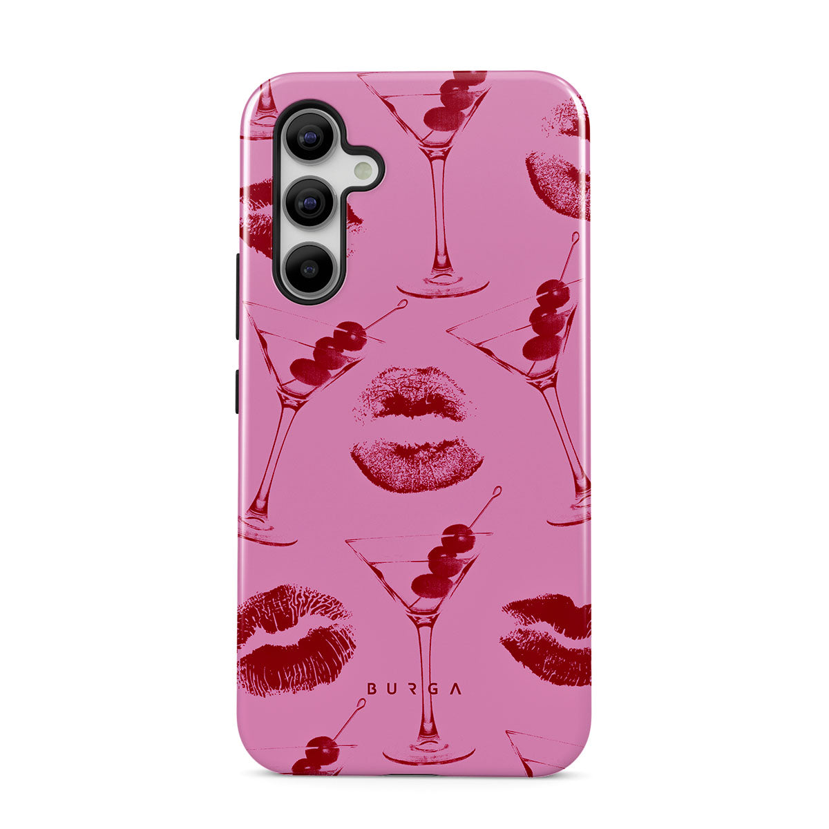 Este diseño presenta: labios rojos, besos, copas de cóctel, martinis.