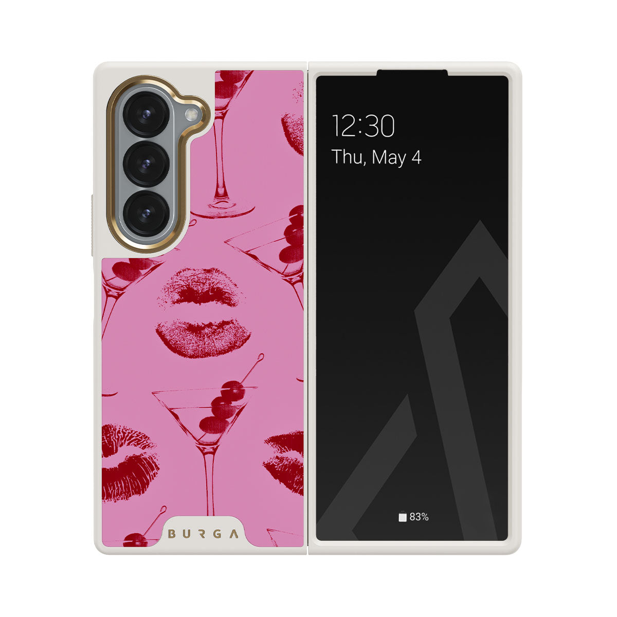 Este diseño presenta: labios rojos, besos, copas de cóctel, martinis.