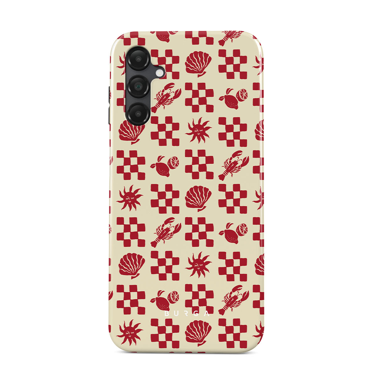 En este diseño: Patrones a cuadros rojos, conchas, langosta, motivos italianos.