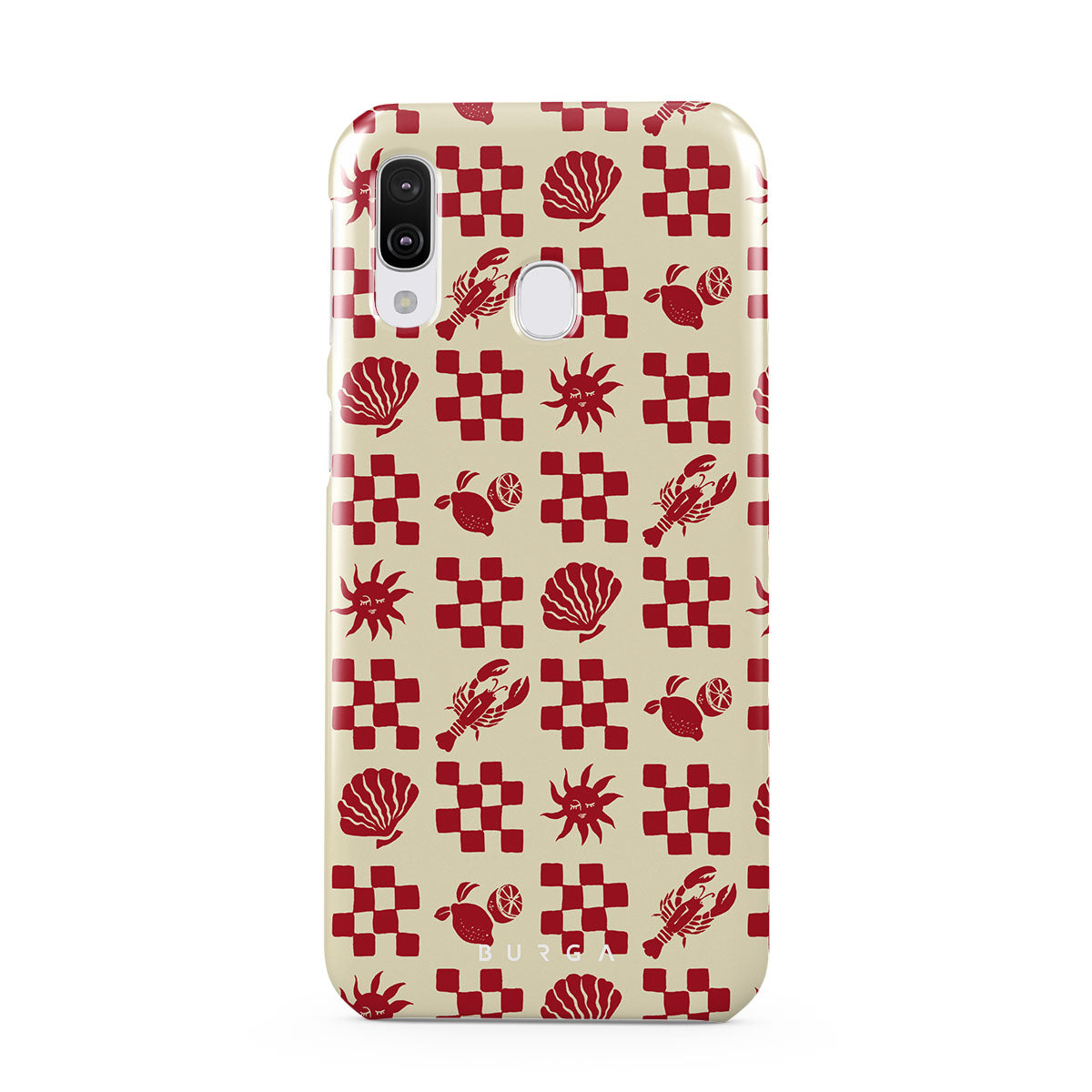 En este diseño: Patrones a cuadros rojos, conchas, langosta, motivos italianos.