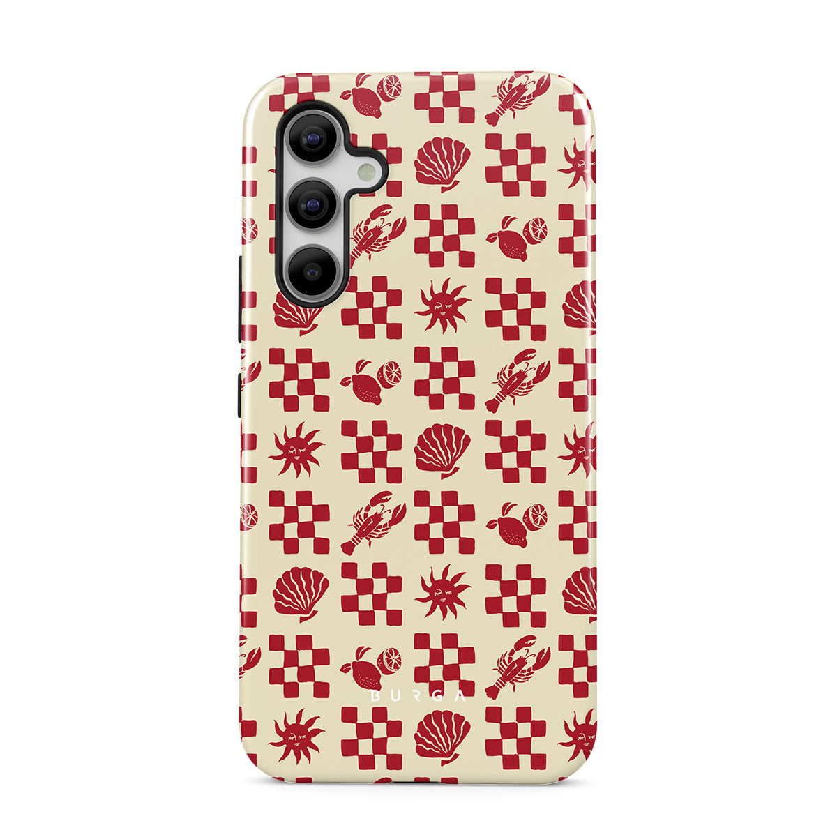 En este diseño: Patrones a cuadros rojos, conchas, langosta, motivos italianos.