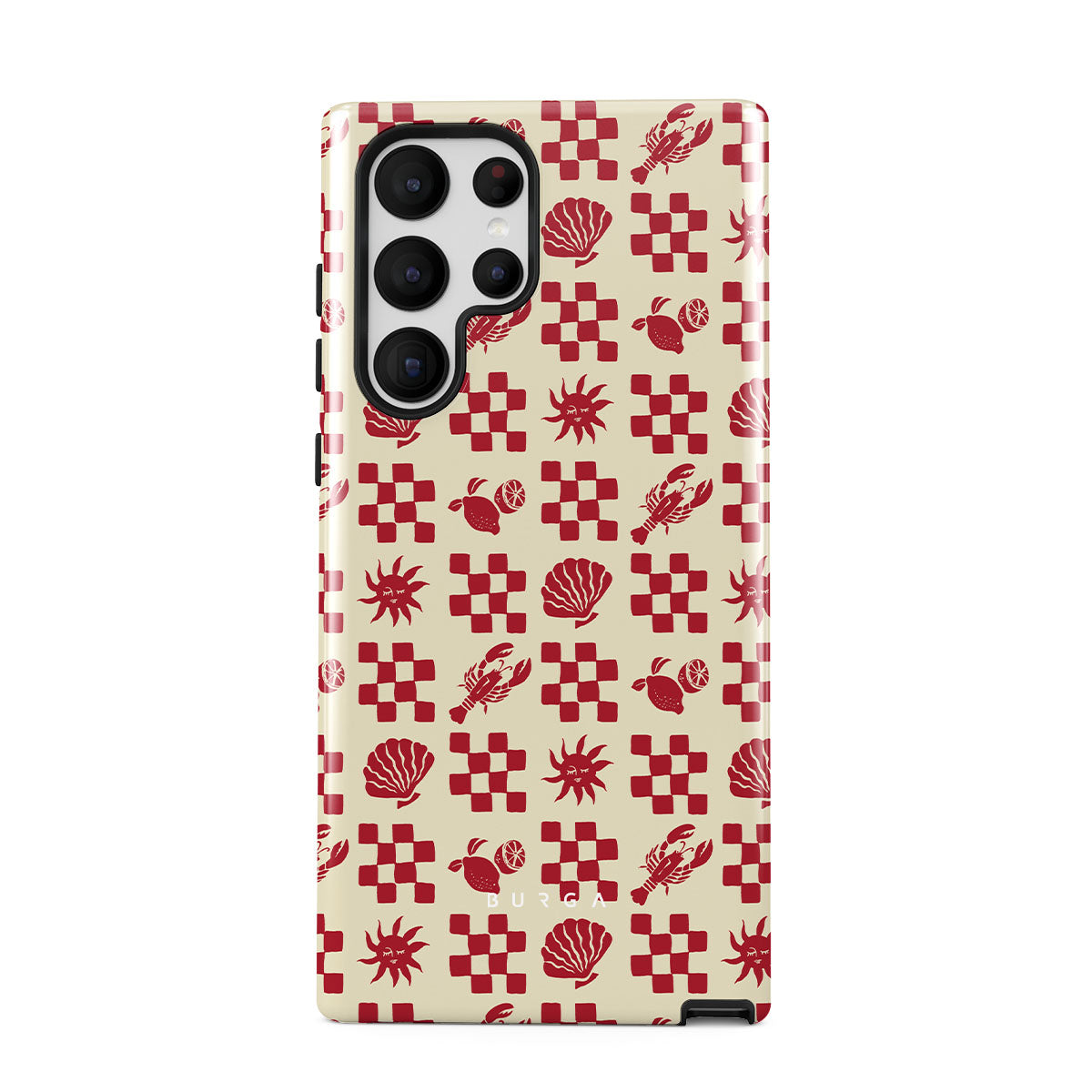 En este diseño: Patrones a cuadros rojos, conchas, langosta, motivos italianos.