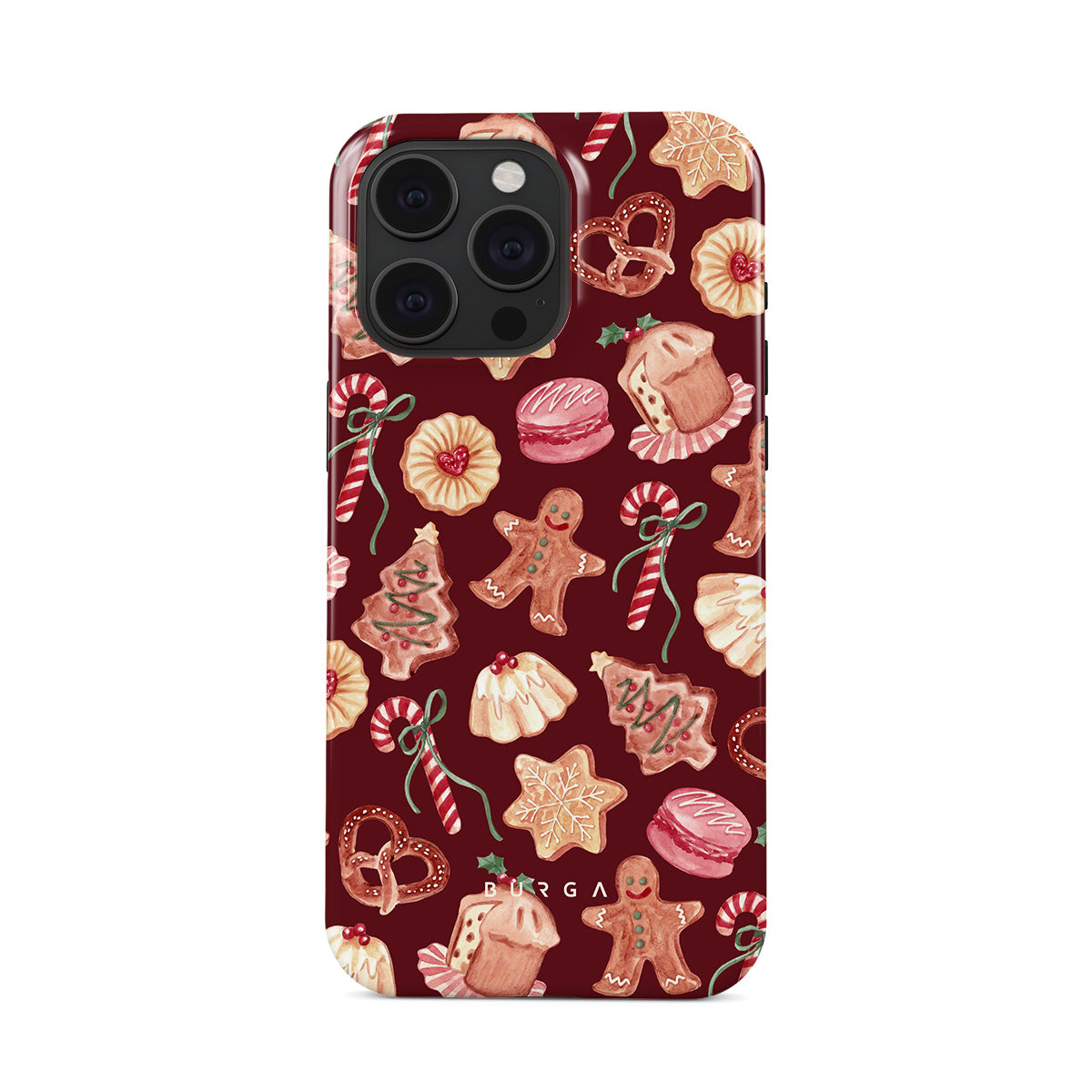 En este diseño: galletas de Navidad, hombres de jengibre, bastones de caramelo, caramelos de menta, dulces festivos, fondo rojo burdeos