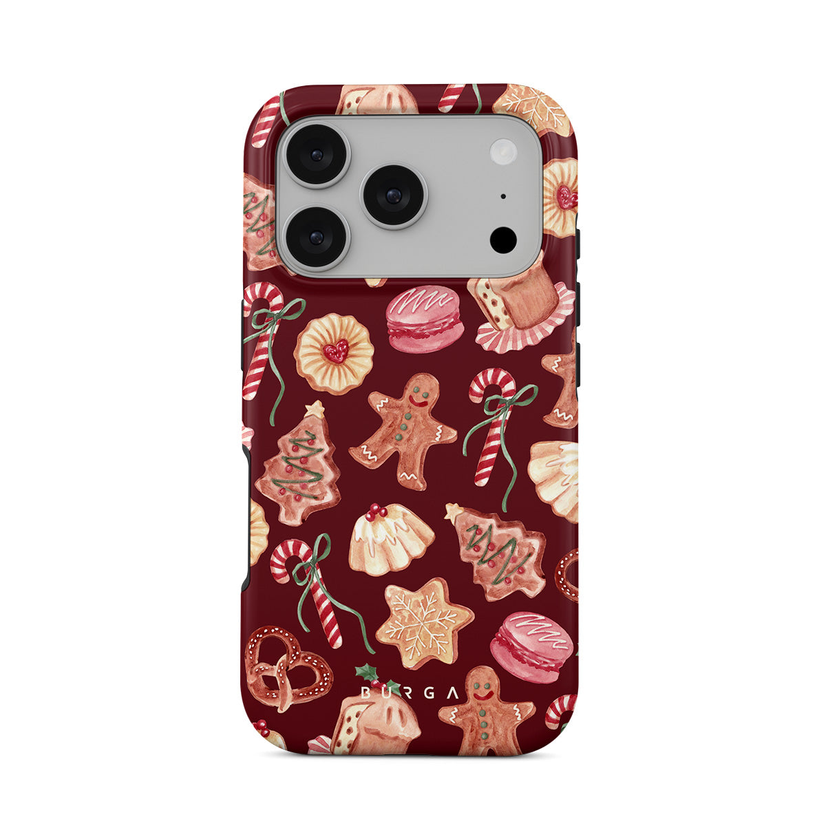 En este diseño: galletas de Navidad, hombres de jengibre, bastones de caramelo, caramelos de menta, dulces festivos, fondo rojo burdeos