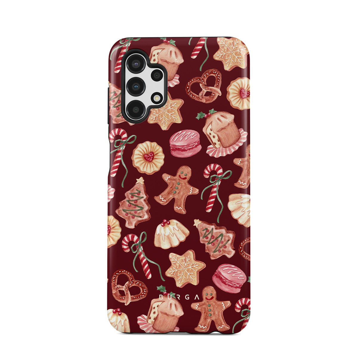 En este diseño: galletas de Navidad, hombres de jengibre, bastones de caramelo, caramelos de menta, dulces festivos, fondo rojo burdeos