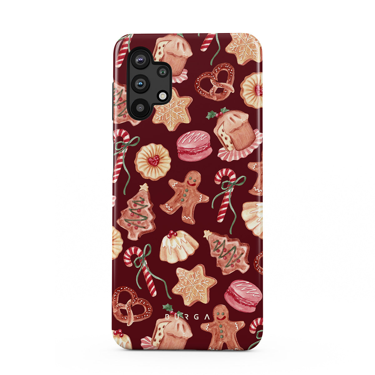 En este diseño: galletas de Navidad, hombres de jengibre, bastones de caramelo, caramelos de menta, dulces festivos, fondo rojo burdeos