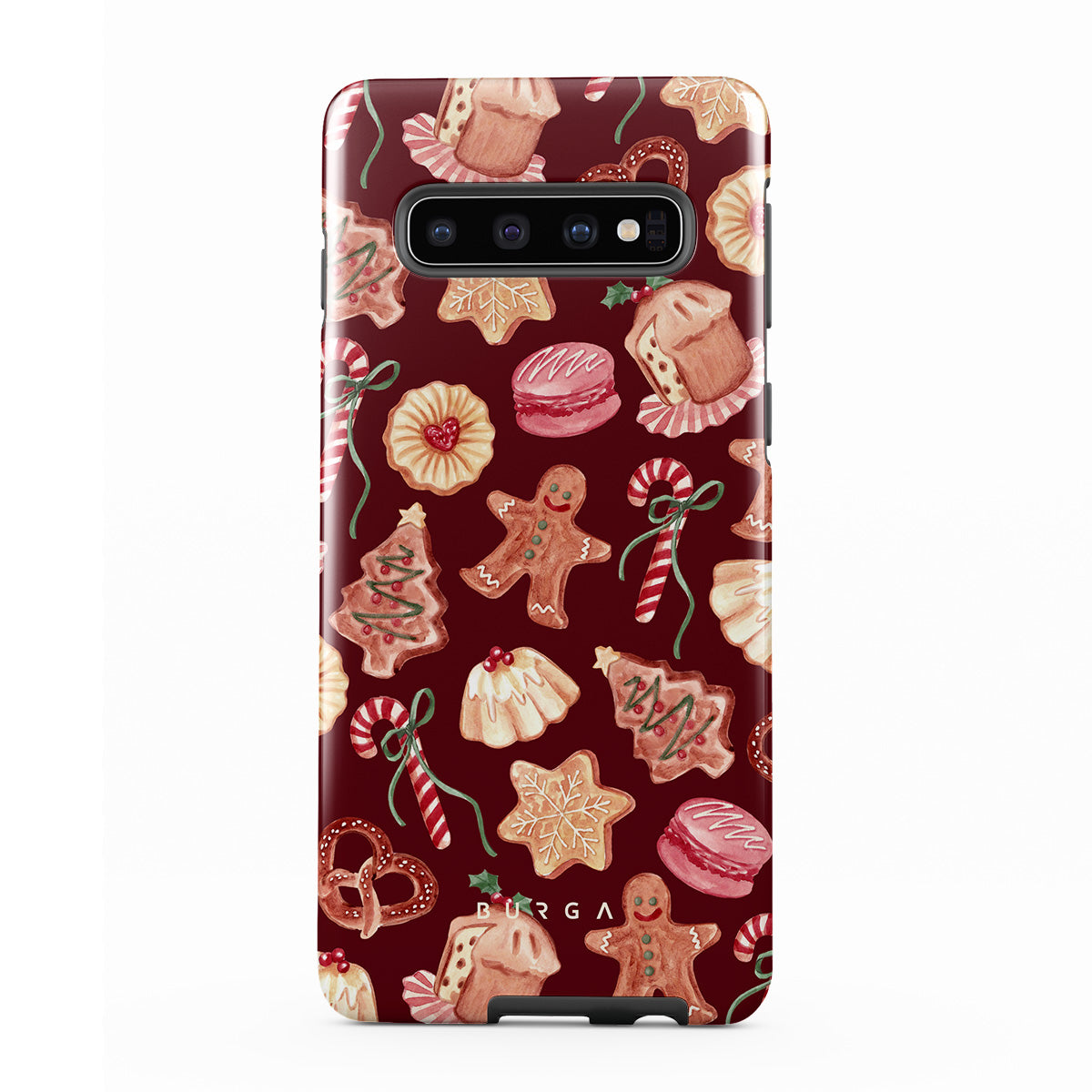 En este diseño: galletas de Navidad, hombres de jengibre, bastones de caramelo, caramelos de menta, dulces festivos, fondo rojo burdeos